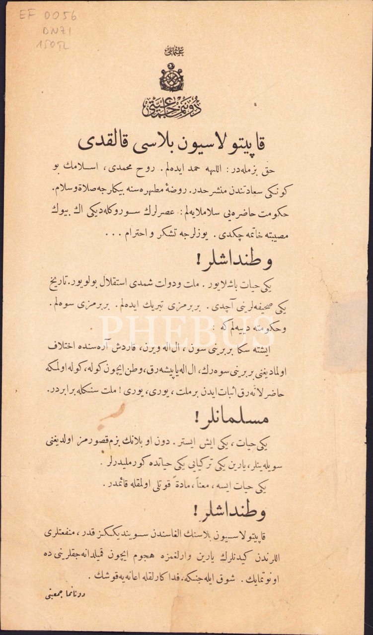 Donanma Cemiyeti´nden halka sesleniş metni: "Kapitülasyon Belası Kalkdı", 16x28 cm