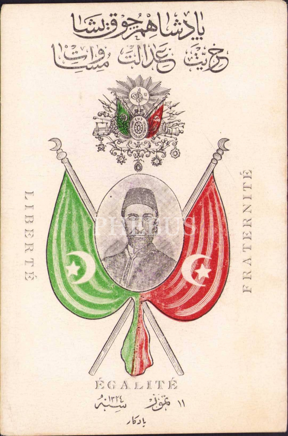 "Padişahım Çok Yaşa" ve "Hürriyet, Adalet, Müsavat" yazılı Meşrutiyet kartpostalı
