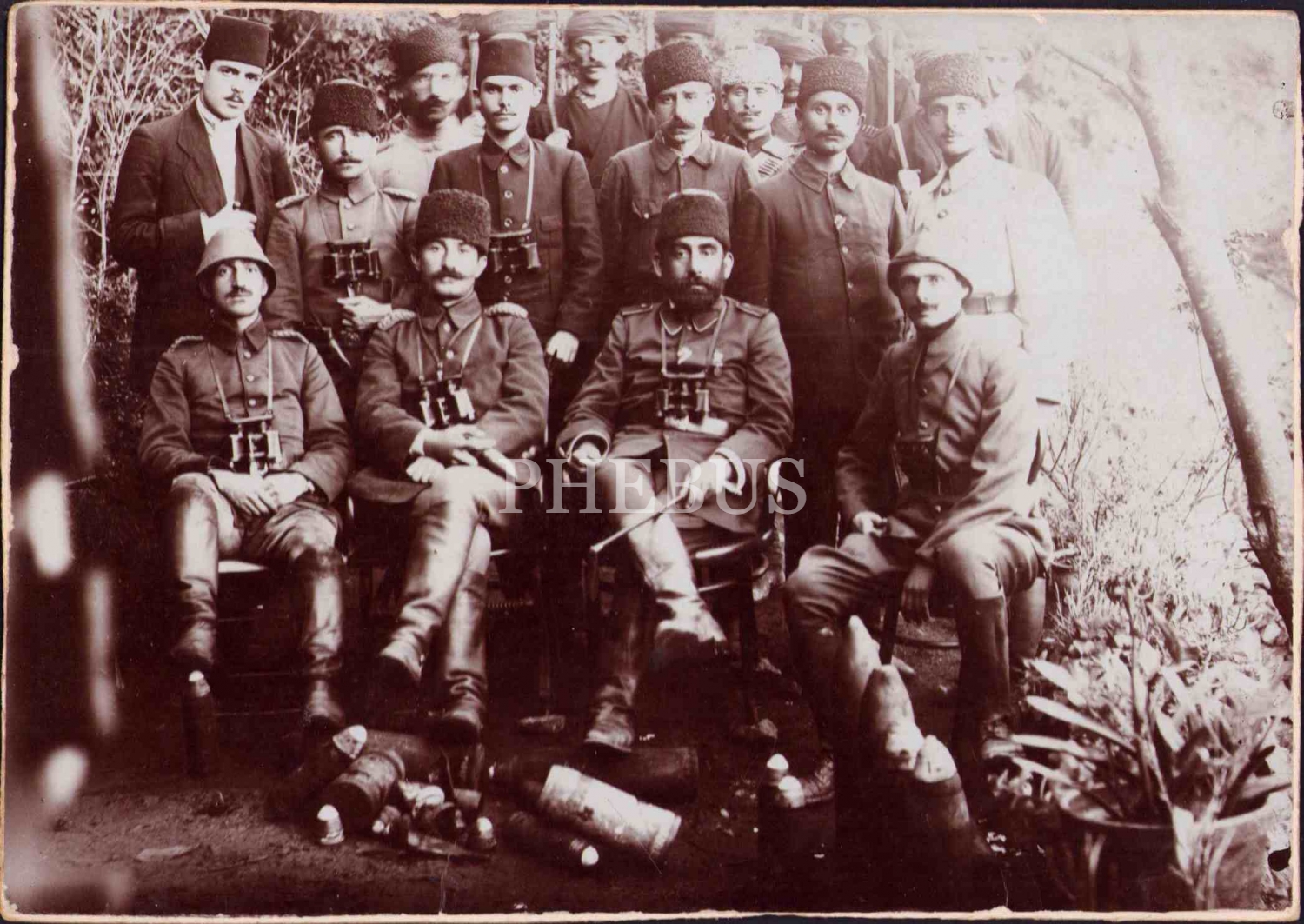 Havanların görüldüğü mekânda toplu poz veren Osmanlı askerlerinin cephe hatırası, 12x17 cm