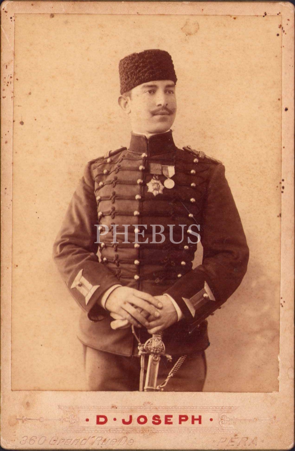 Nişanlı ve madalyalı Osmanlı askerinin 1319 tarihli ve ithaflı hatıra fotoğrafı, D. Joseph Fotoğrafhanesi-Pera, 11x16 cm