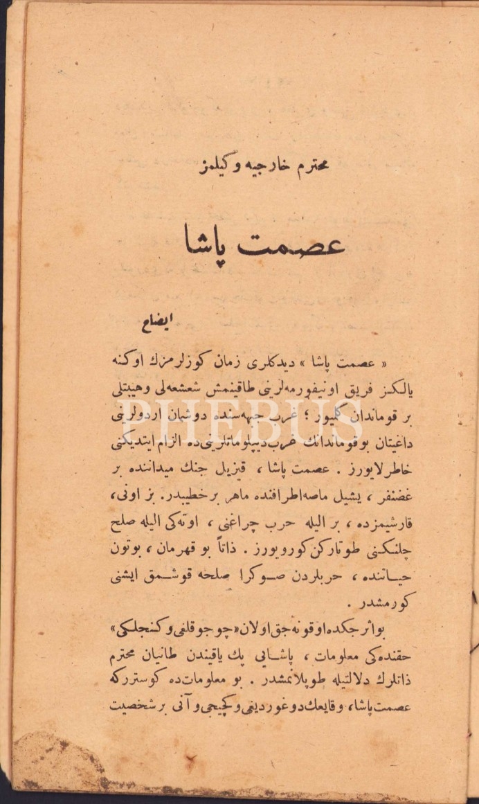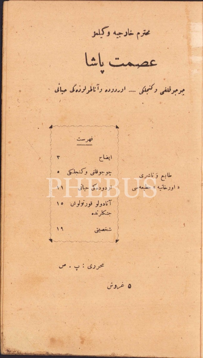 Muhterem Hariciye Vekilimiz İSMET PAŞA (Çocukluğu ve Gençliği-Orduda ve Anadolu´daki Hayatı), yaz. P. S., Orhaniye Matbaası, 22 s., 12x20 cm