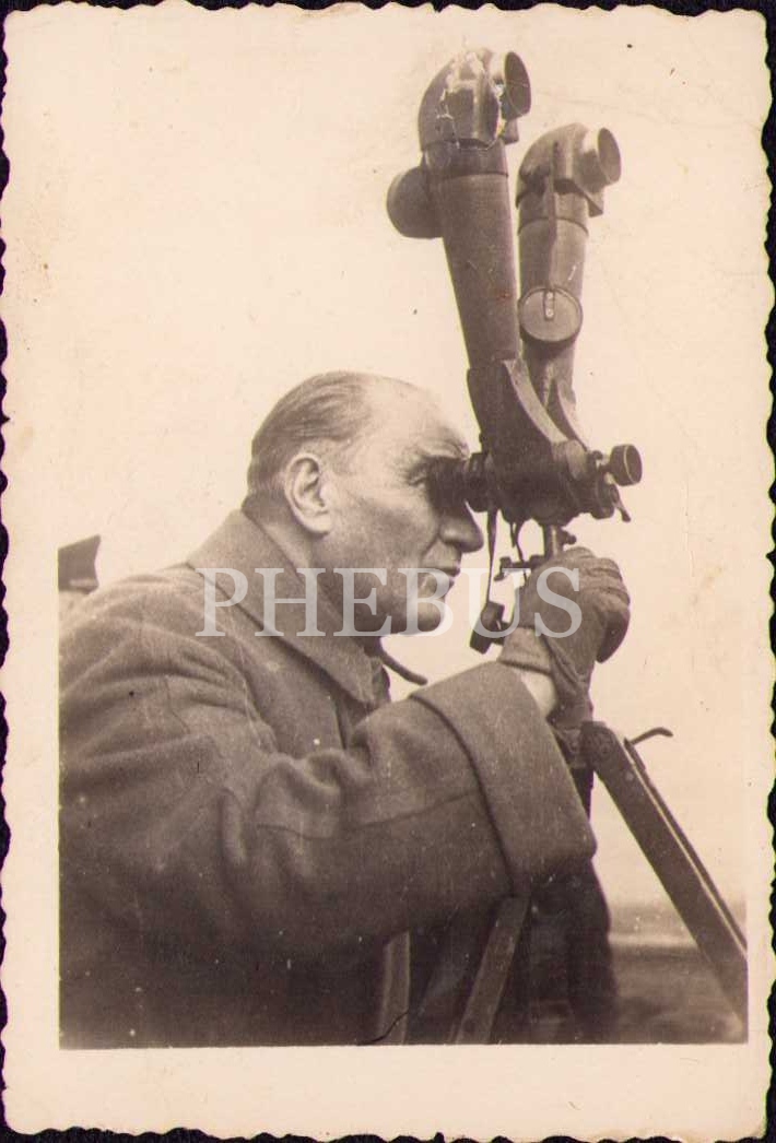 Mustafa Kemal Atatürk dürbünle bakarken, 6x9 cm, kırık haliyle