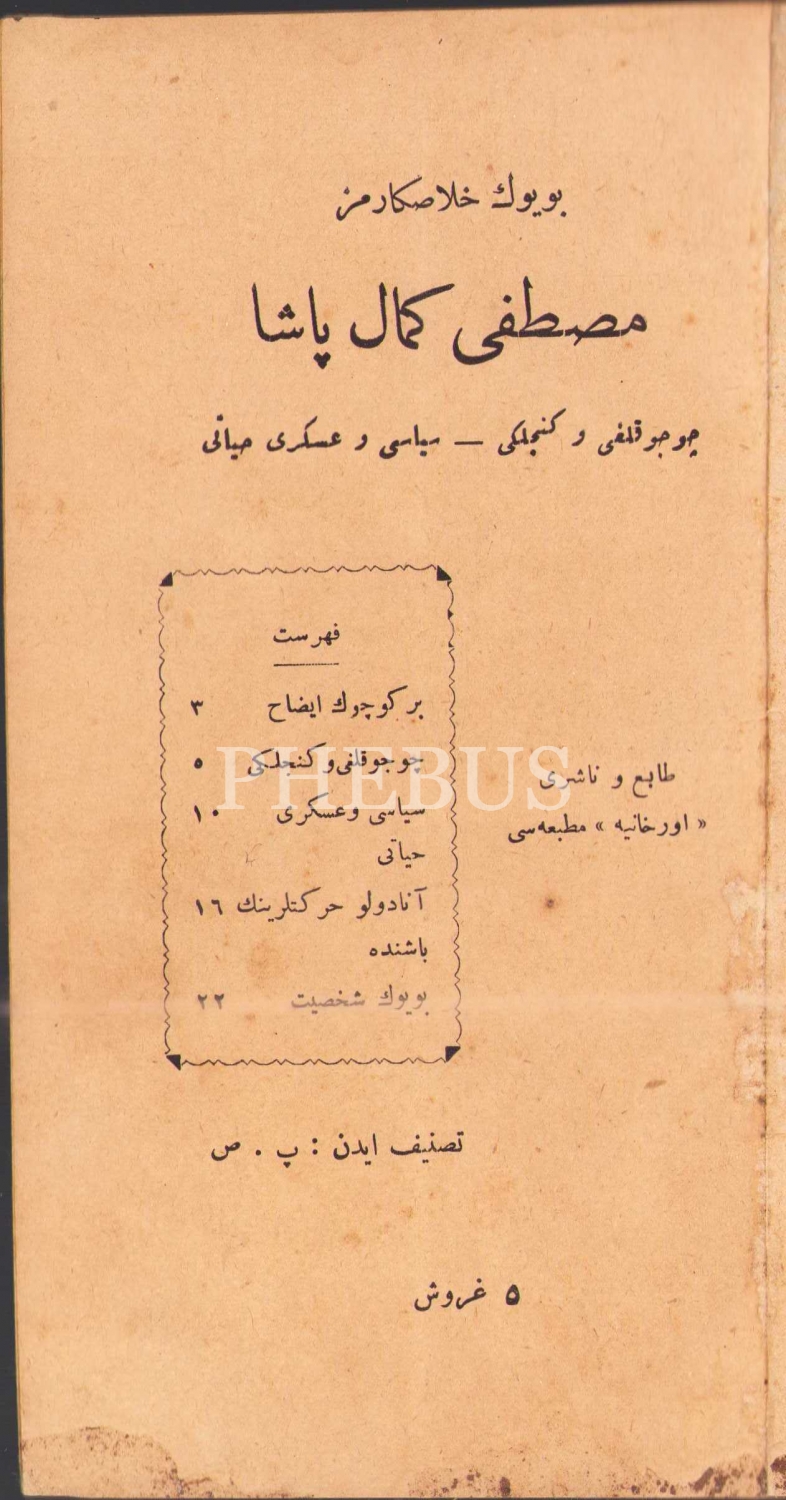 İlk Reisicumhurumuz MUSTAFA KEMAL PAŞA (Çocukluğu- Gençliği- Siyasi-Askerî Hayatı), haz. P. S., Orhaniye Matbaası, 24 s., 12x20 cm, kapak sayfası kısmen ayrık haliyle