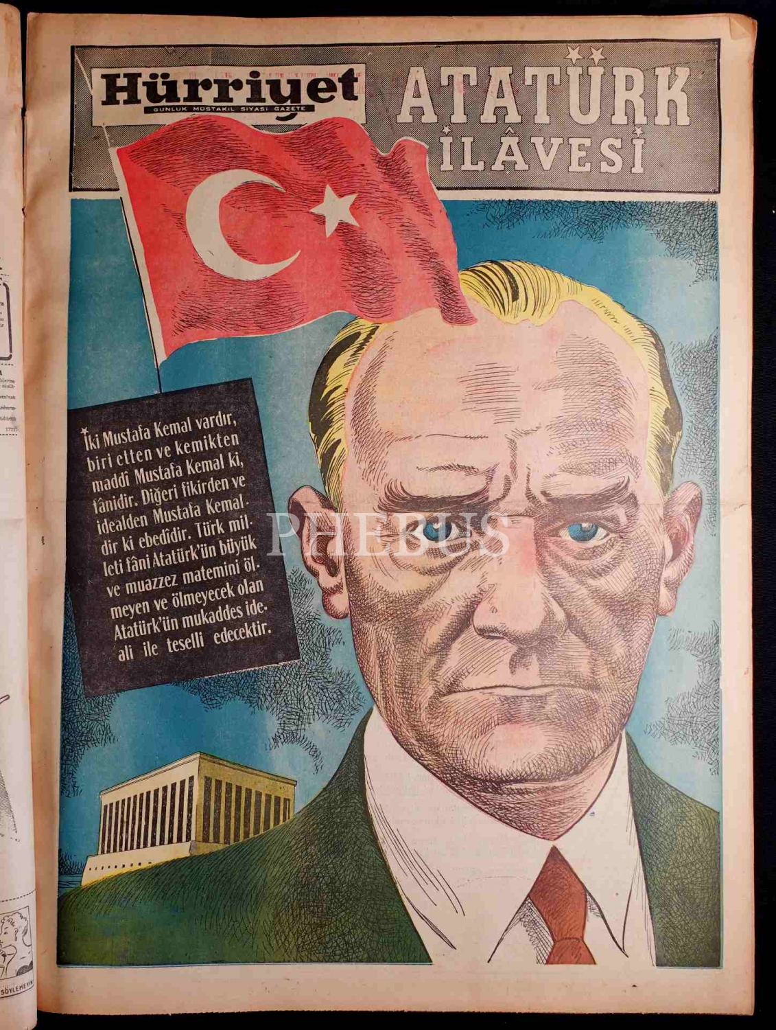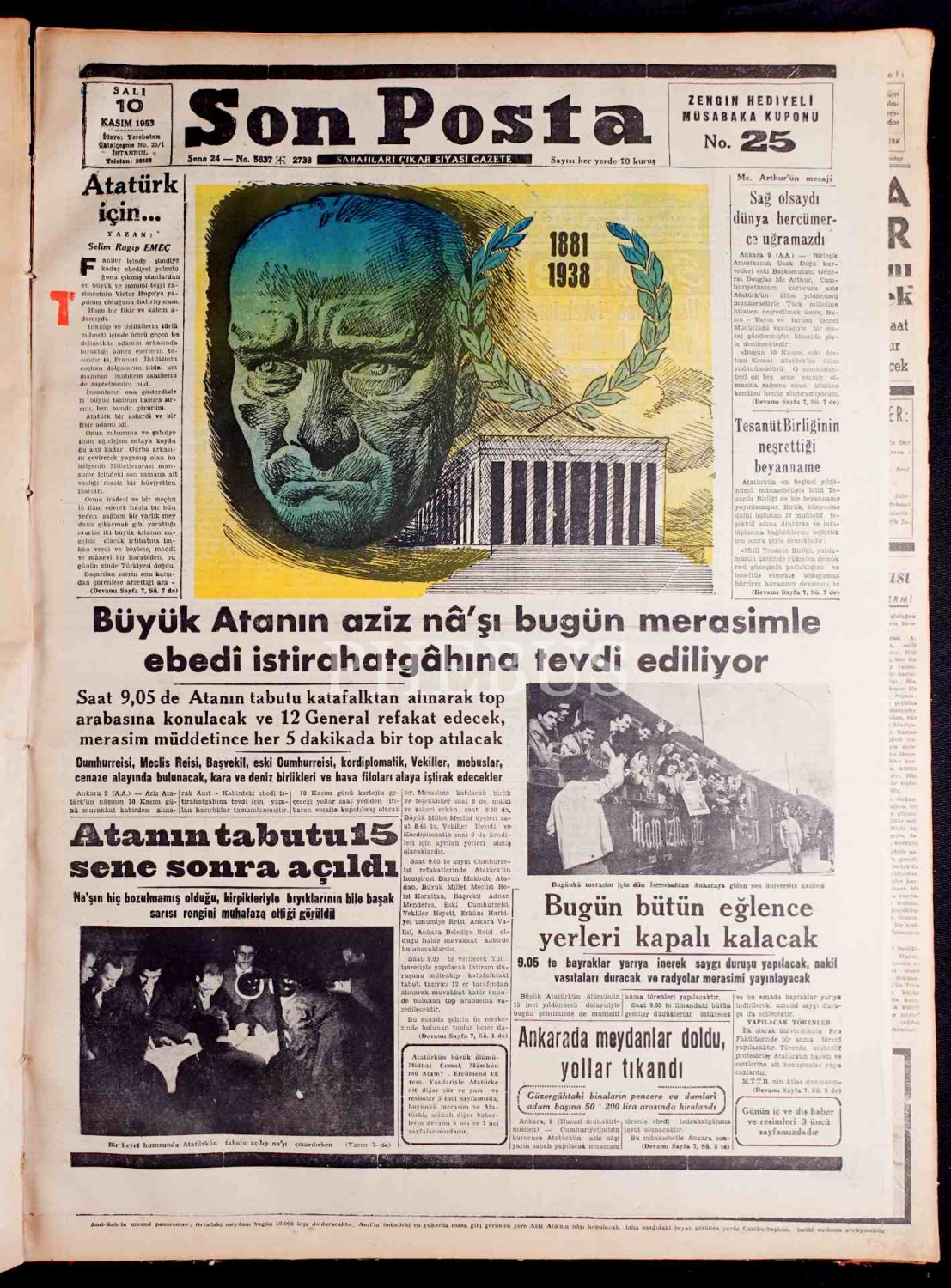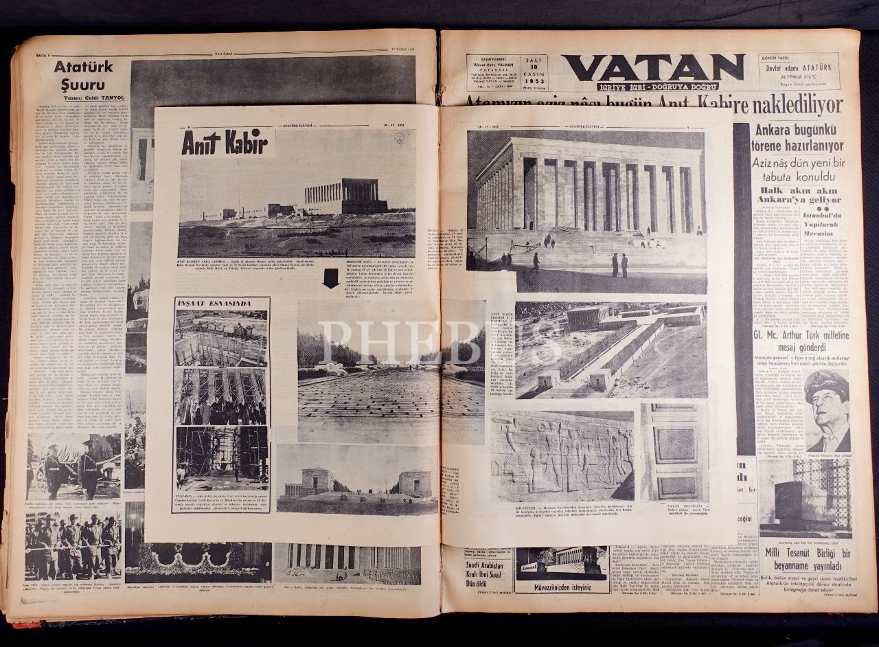 Atatürk´ün naaşının ölüm yıldönümünde Anıtkabir´e taşınmasını konu edinen Kasım 1953 tarihli 24 adet gazete tek ciltte, 42x58 cm