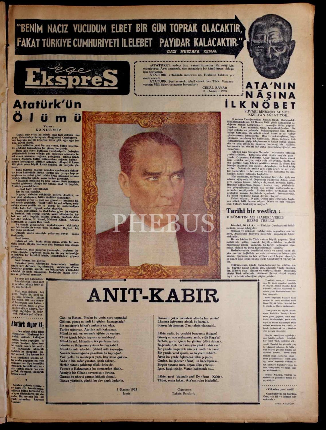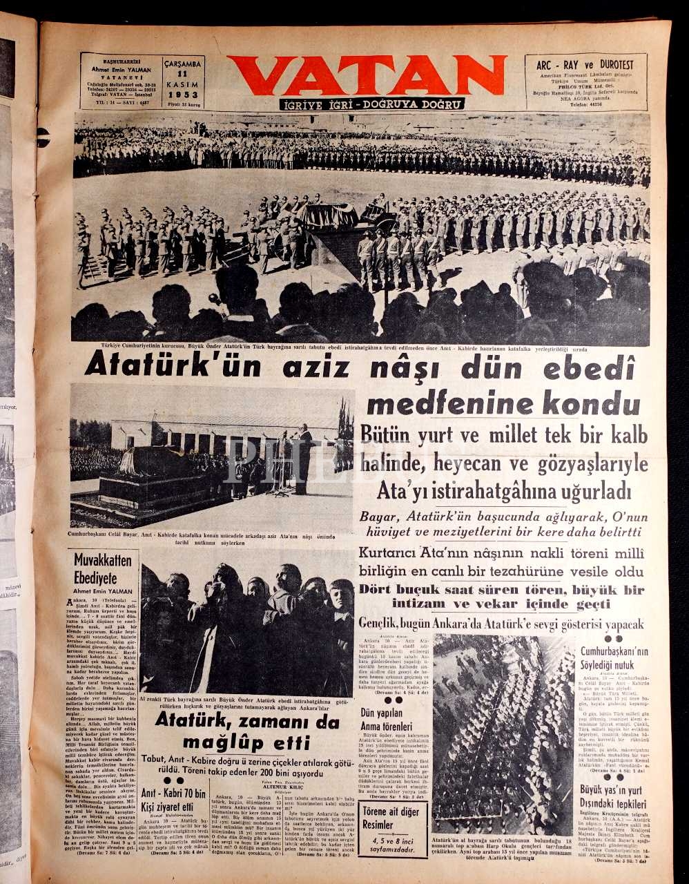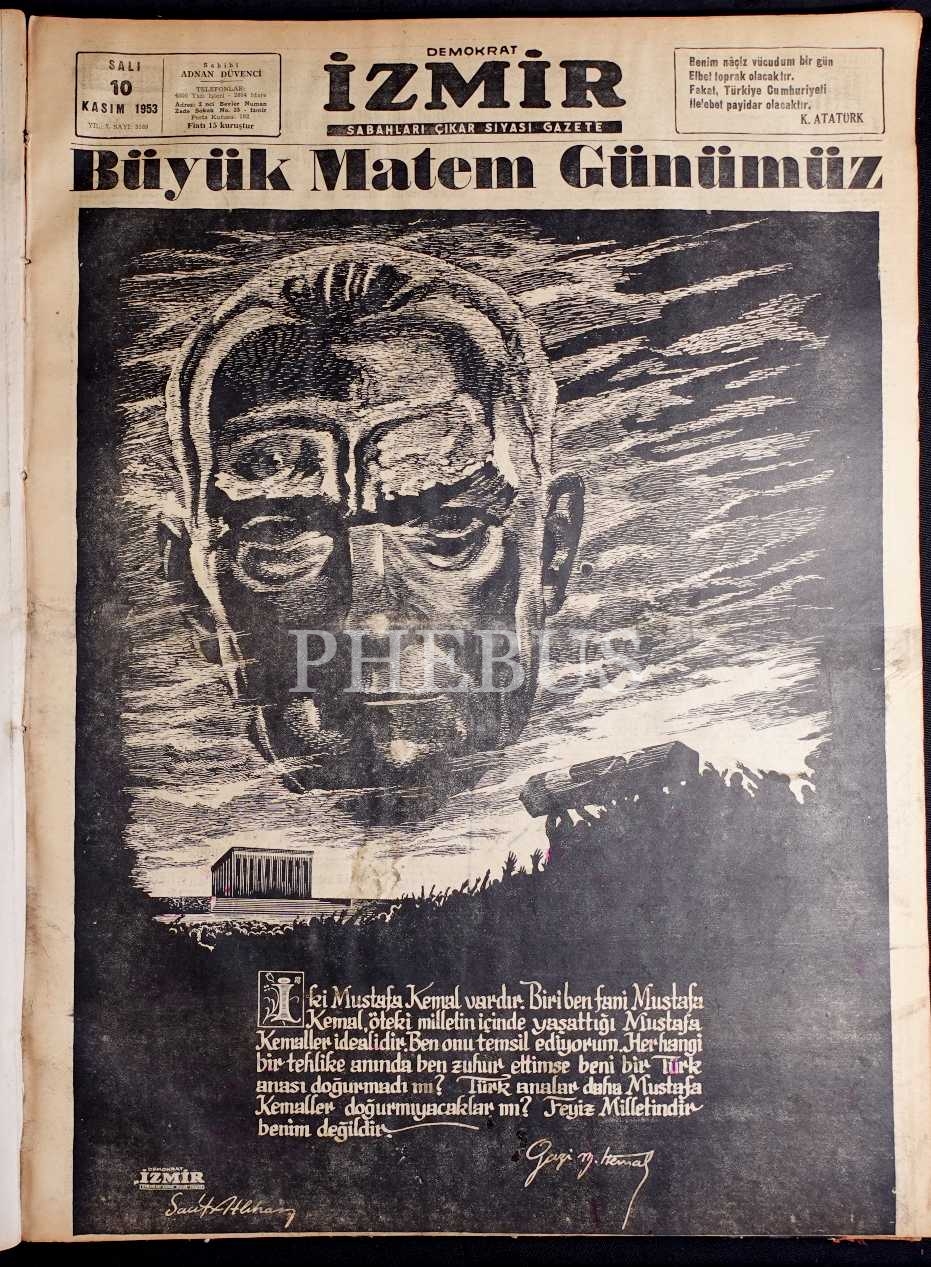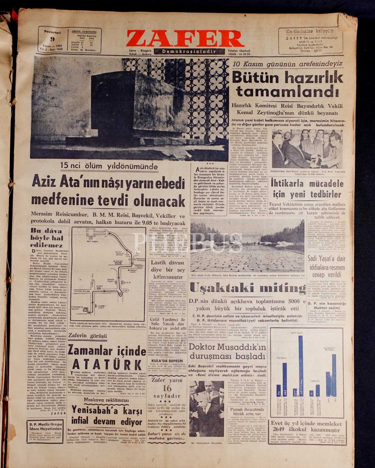 Atatürk´ün naaşının ölüm yıldönümünde Anıtkabir´e taşınmasını konu edinen Kasım 1953 tarihli 24 adet gazete tek ciltte, 42x58 cm