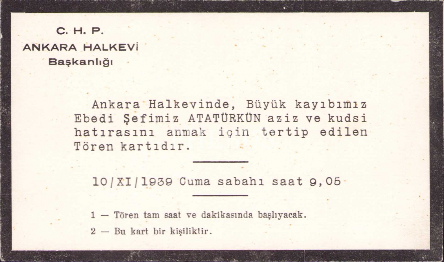 CHP Halkevi Başkanlığı tarafından 1939´da düzenlenen Atatürk´ü anma töreni kartı, 8x14 cm