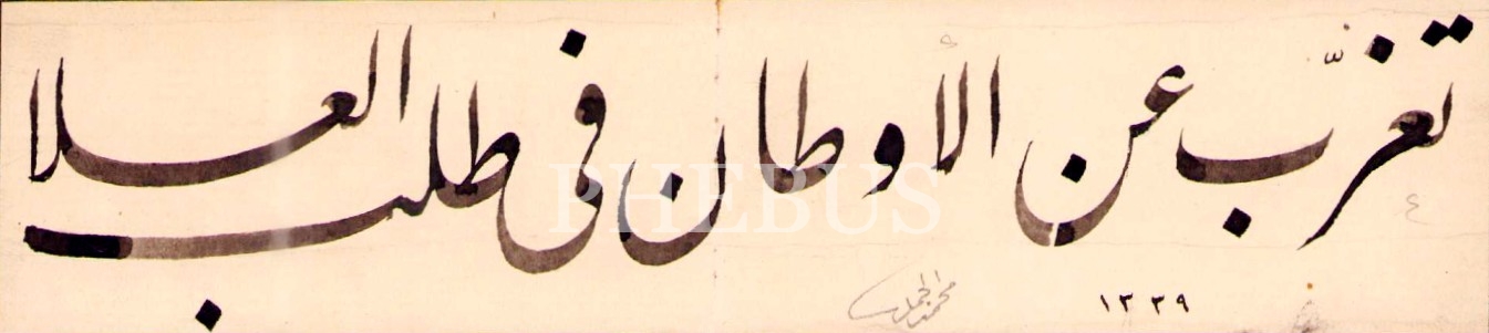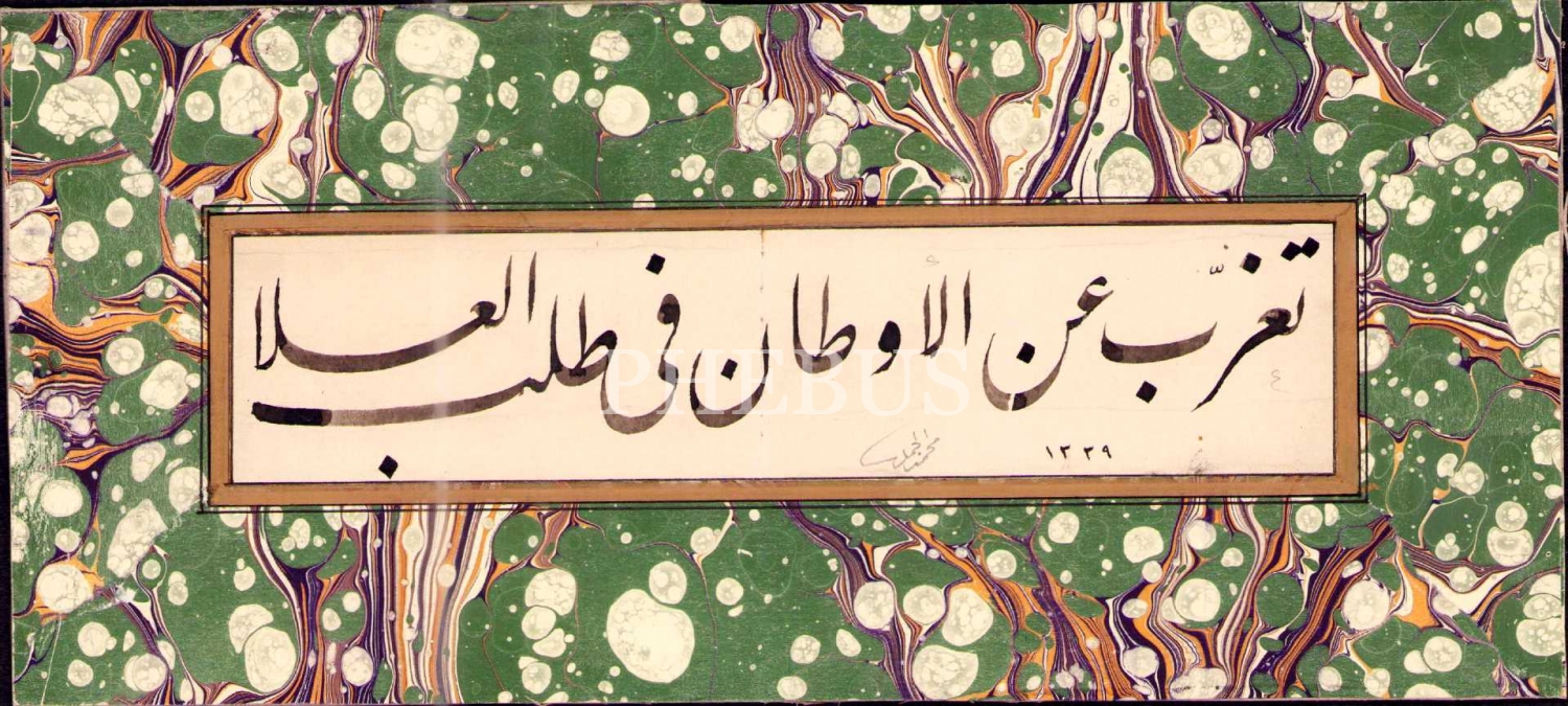 Mehmed Cemil ketebeli ve 1339 tarihli ta´lik yazı: "Tegarreb ani'l-evtân fî talebi'l-ulâ", ebru pervazlı, yazı: 4x17 cm