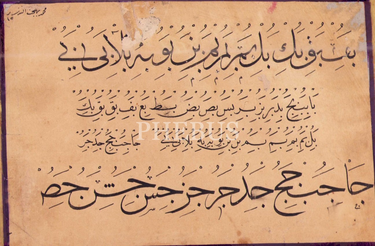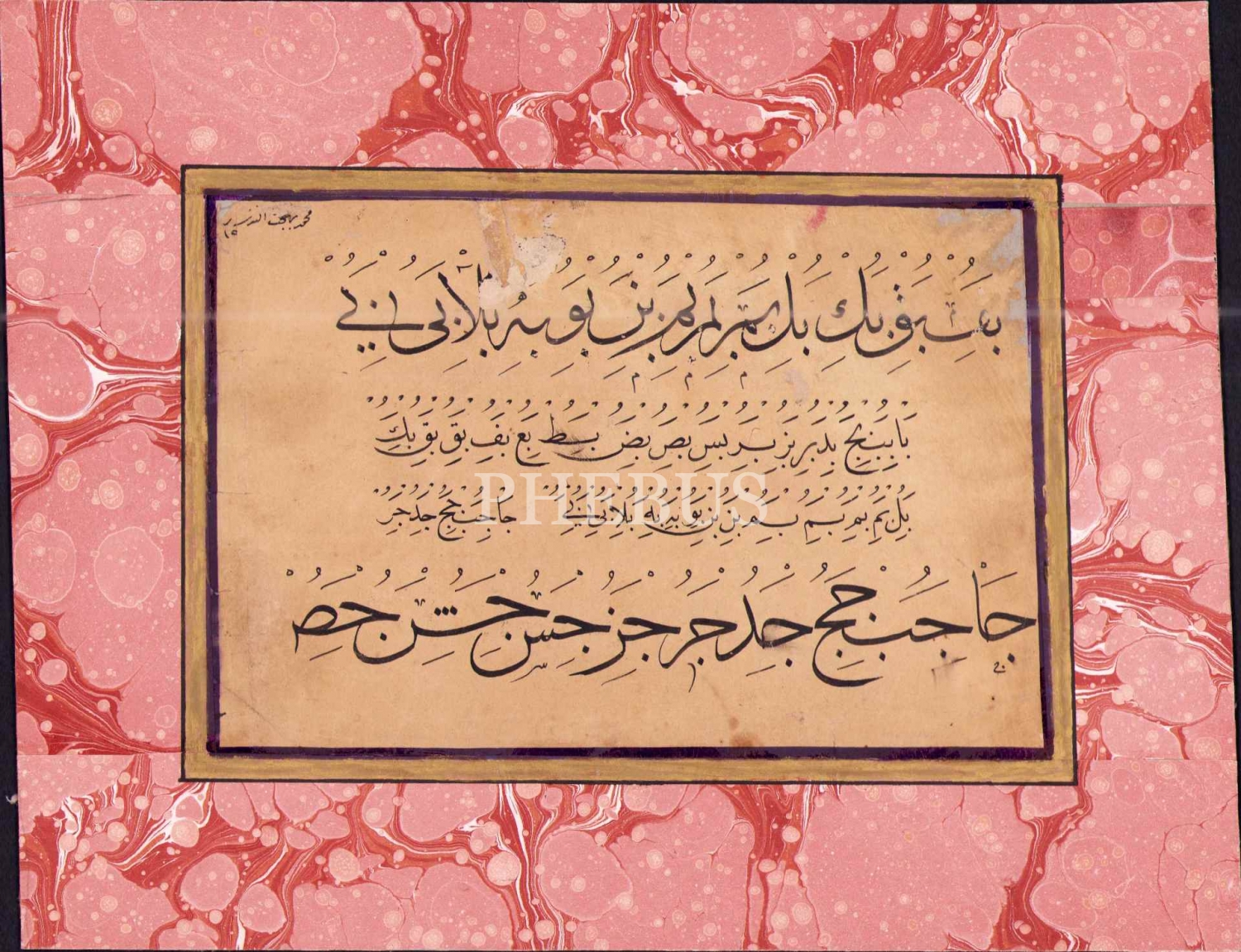 Sülüs-nesih hurufât meşki, ebru pervazlı, yazı: 13x21 cm
