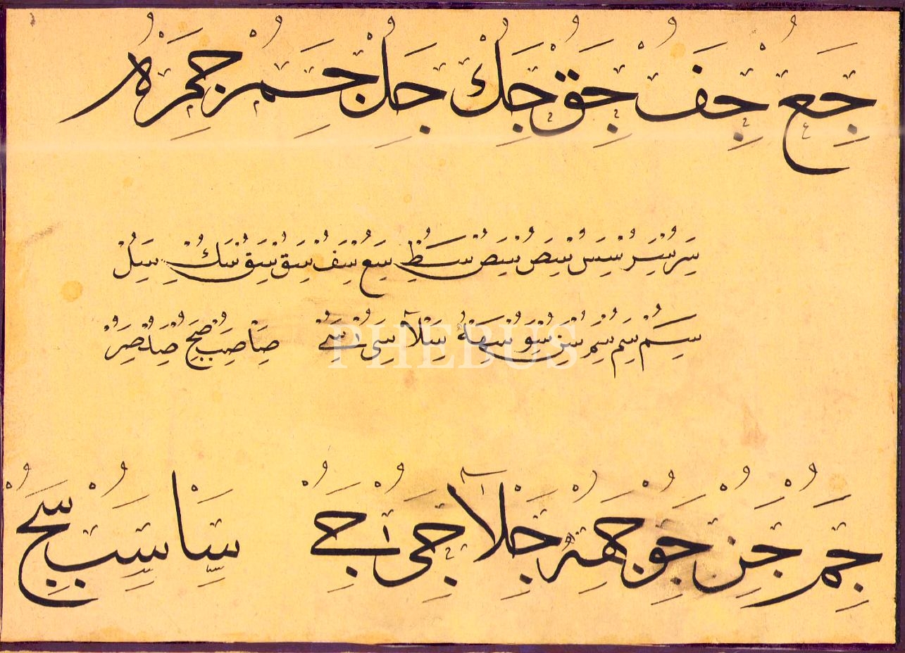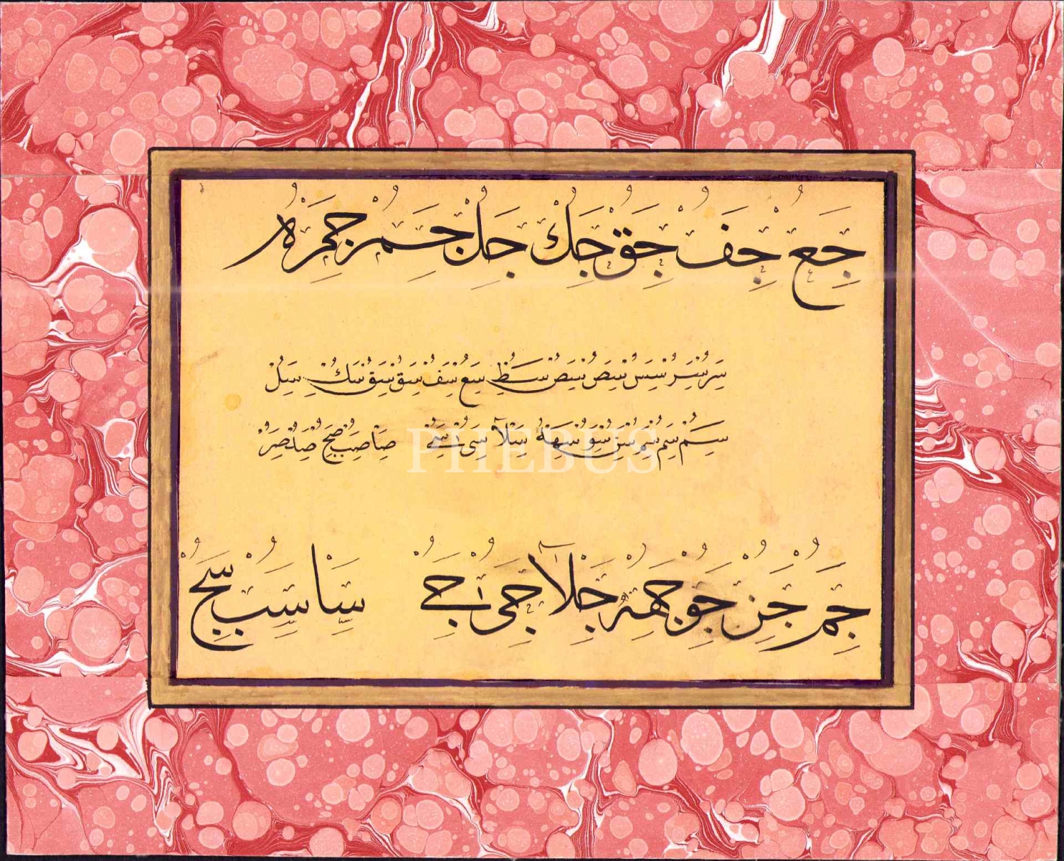 Sülüs-nesih hurufât meşki, ebru pervazlı, yazı: 14x20 cm