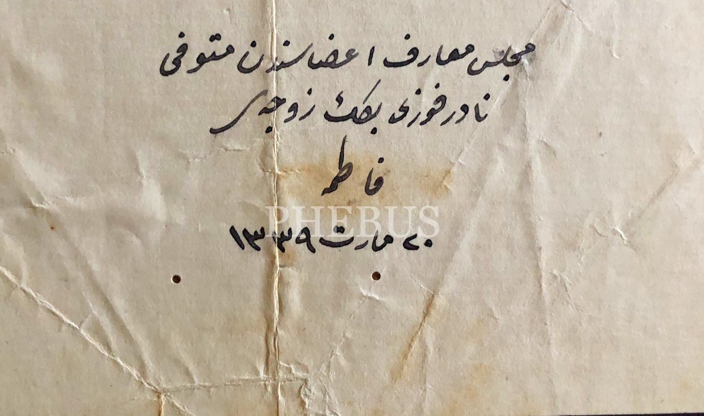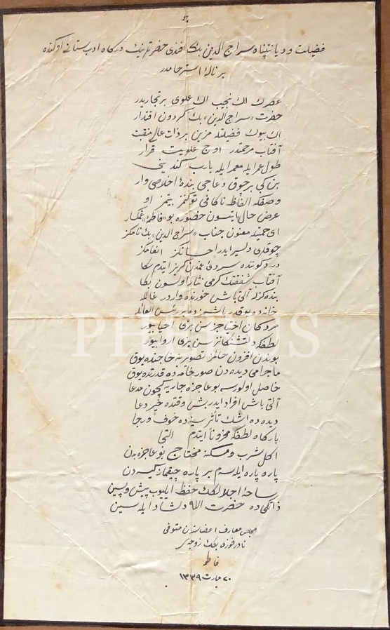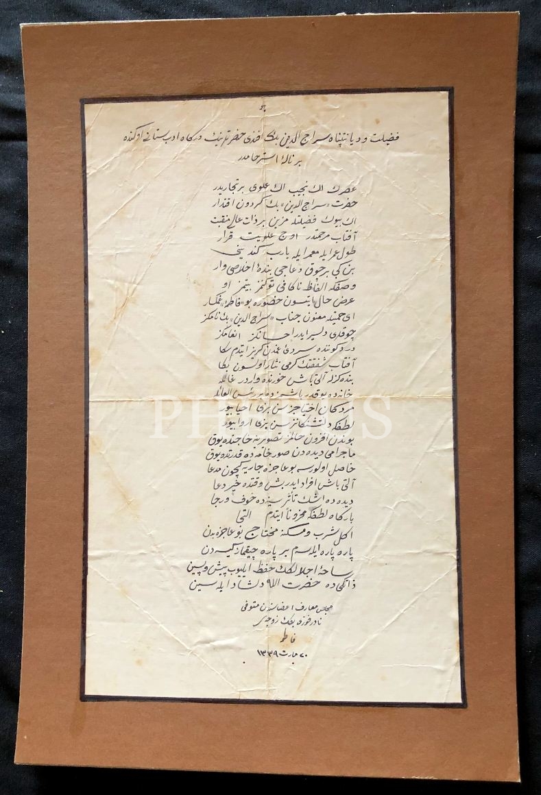 Meclis- i Maarif üyelerinden birinin zevcesi Fatıma'nın kaleme aldığı 1339 tarihli methiye, 31x46 cm
