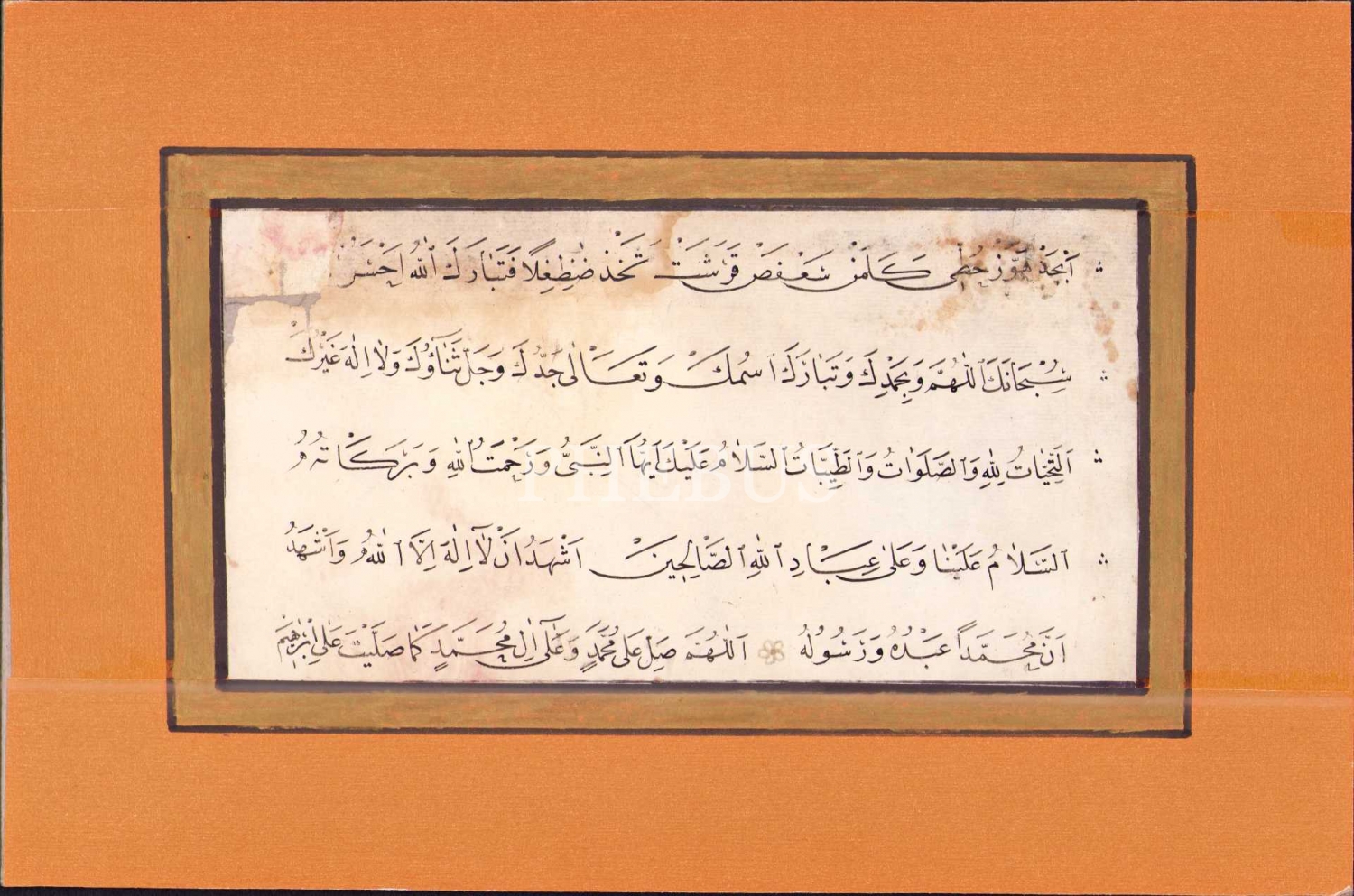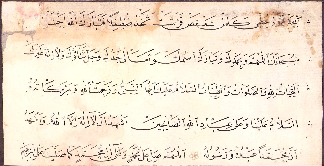 Nesih yazı ile meşk murakkaından bölümler; Ebced formülü ve namaz duaları, 11x22 cm