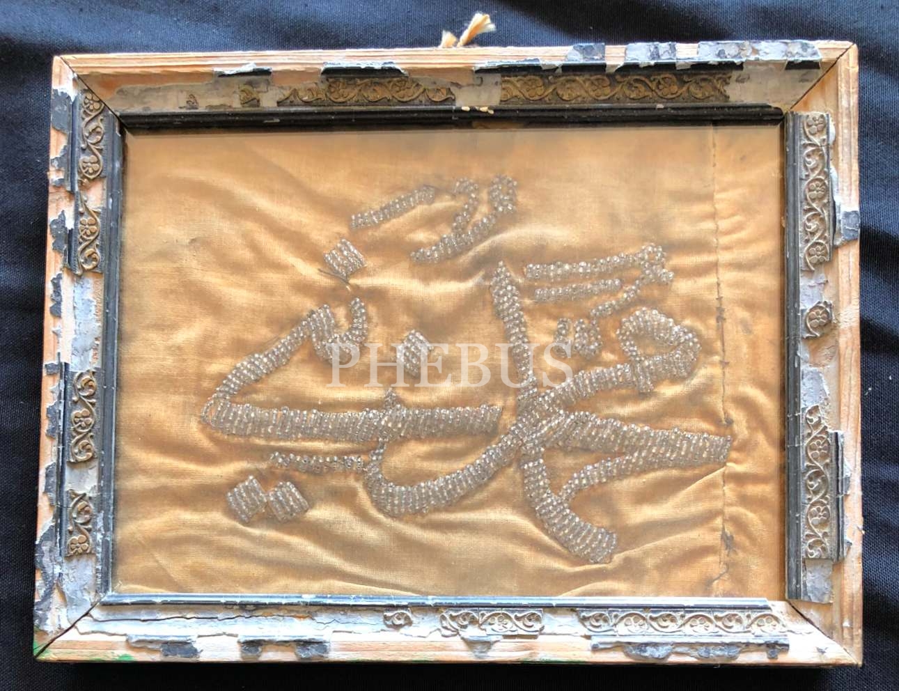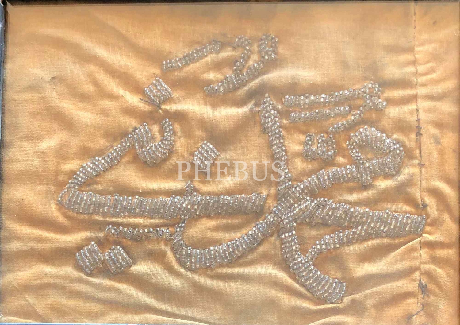 Osmanlı dönemi kumaş üzeri boncuk işleme ile " Muhammed Nebî" yazılı celî sülüs levha, 22x29 cm
