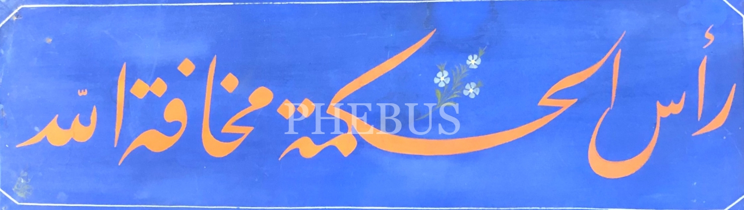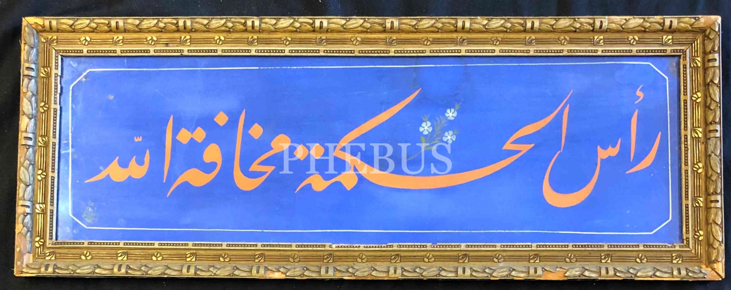 Osman Fevzi (Olçay) ketebeli celî ta'lik yazı: " Re'sü'l hikmeti mehâfetullah (Hikmetin başı Allah korkusudur)", yazı: 20x68 cm