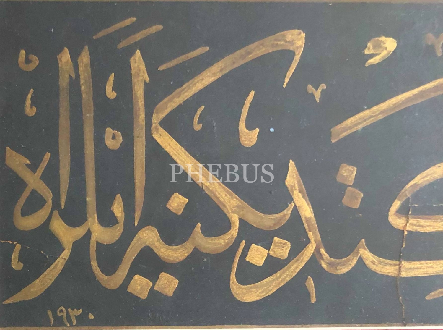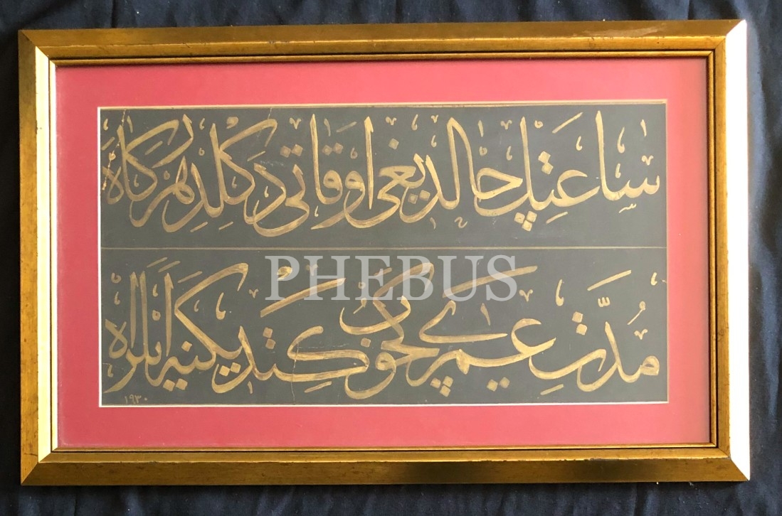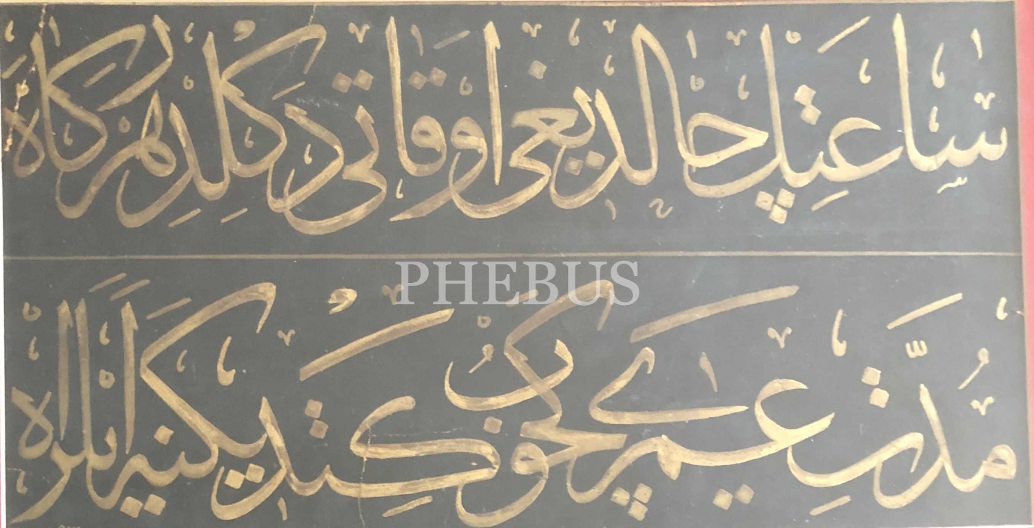 1930 tarihli zerendut sülüs yazı; " Saatin çaldığı evkâtı değildir herkâha, Müddet-i ömrü geçip gittiğine eyler âh!", yazı: 25x48 cm