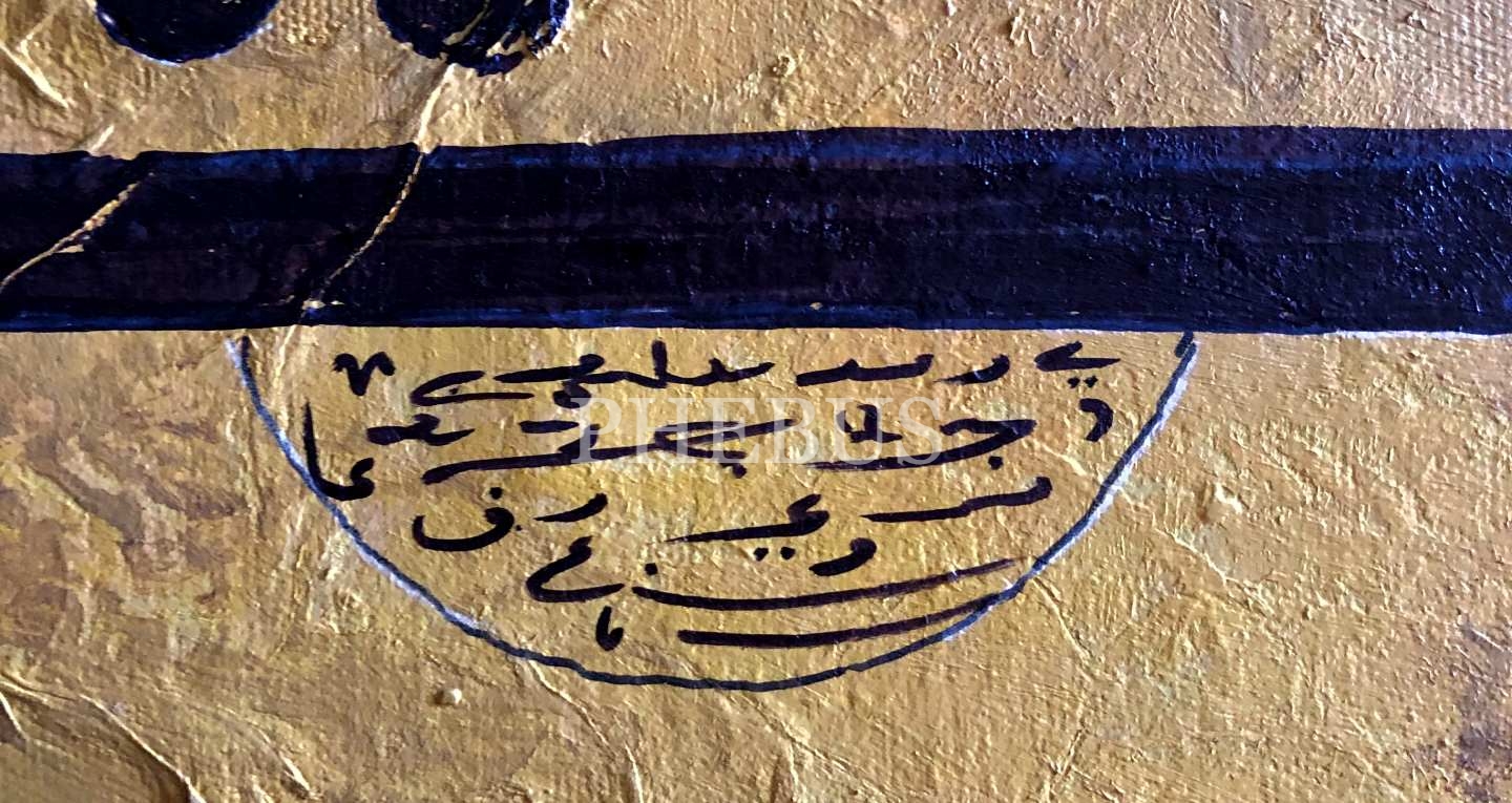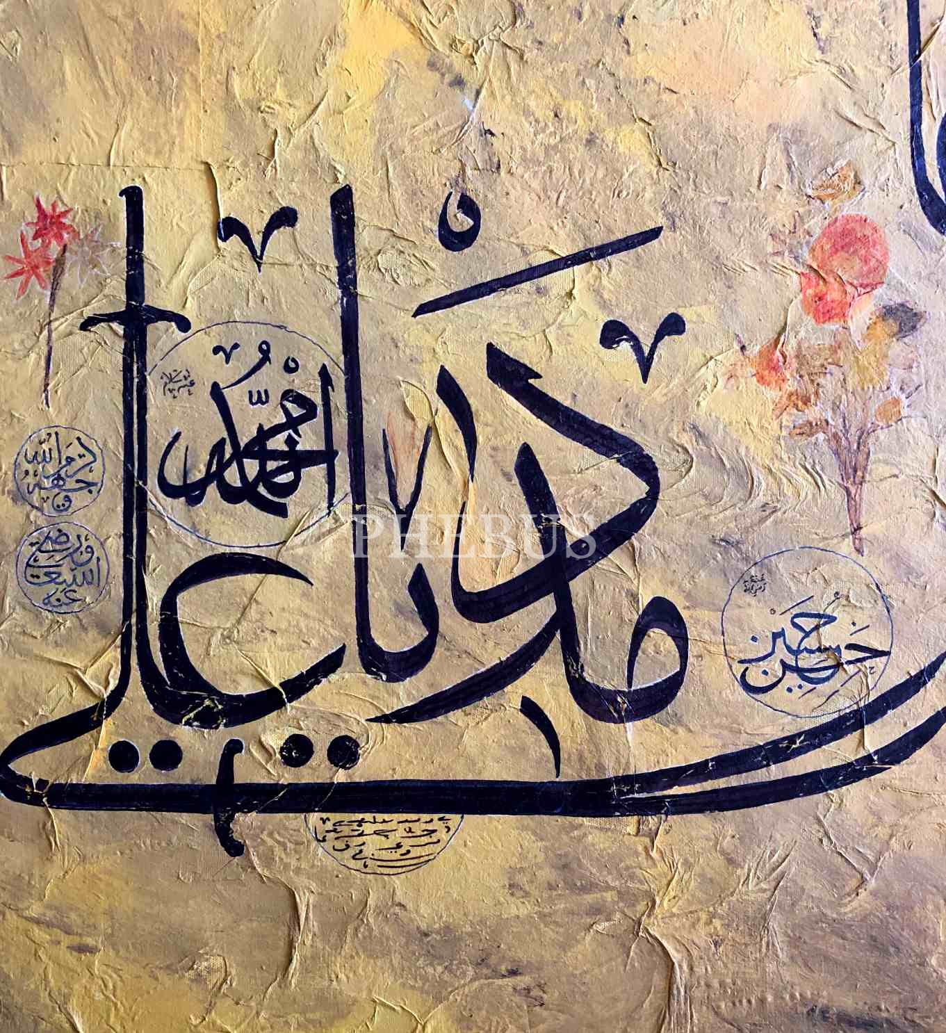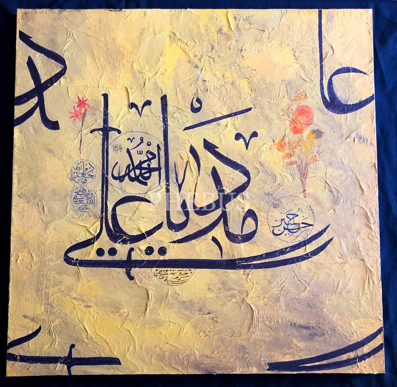 Tuval üzeri serbest tasarım yazı; "Medet Yâ Ali", 70x70 cm