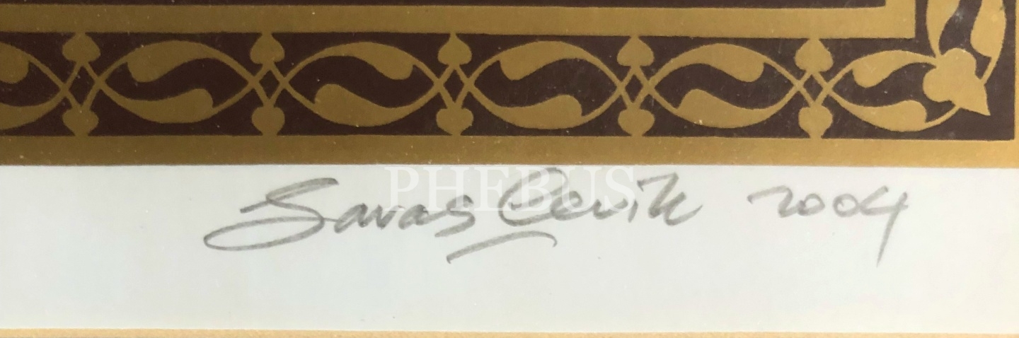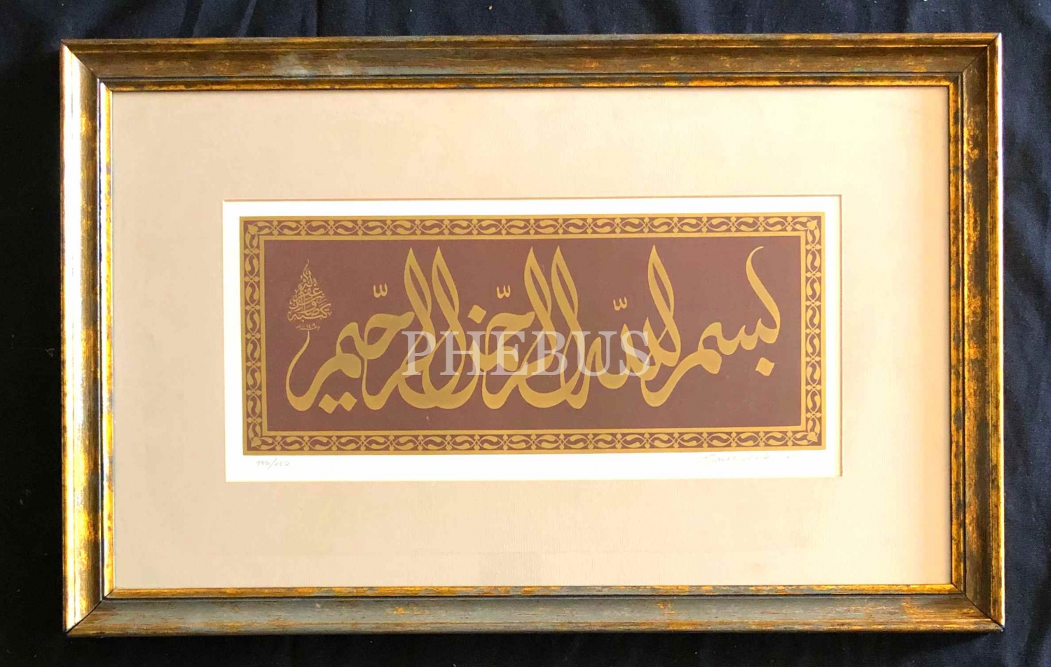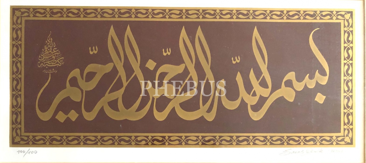 Savaş Çevik ketebeli, 1309 tarihli özgün baskı Besmele, 2004 tarihli, yazı: 15x35 cm, kurşun kalem ile hattat imzalı