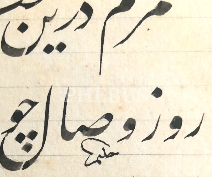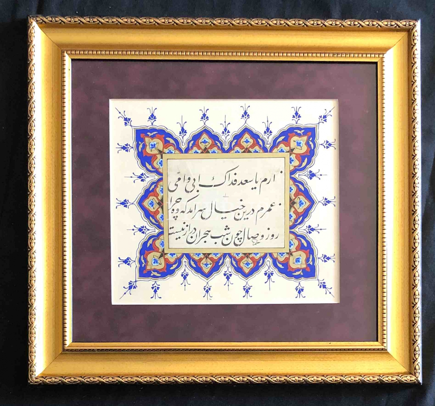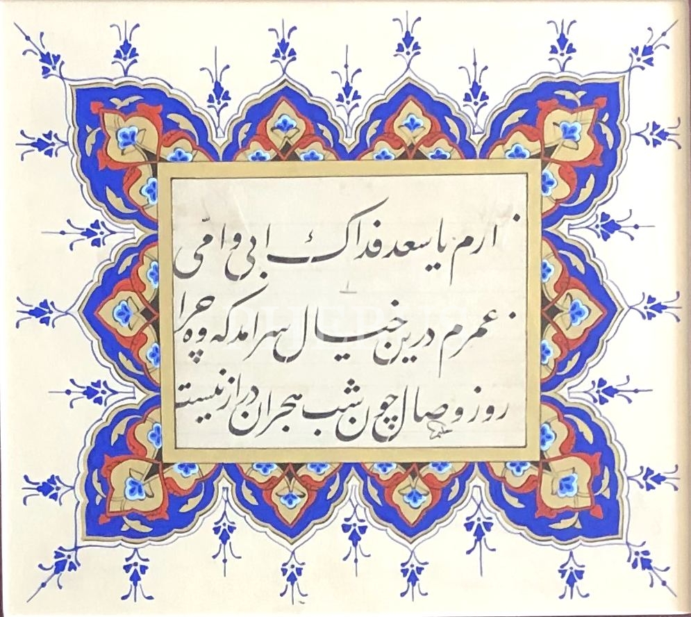 Halim(Özyazıcı) ketebeli ve tezhipli ta'lik yazı: "İrmi Yâ Sa'd fidâke ebî ve ümmî... [Okunu at Ey Sad, anam babam sana feda olsun]", yazı: 11x14 cm