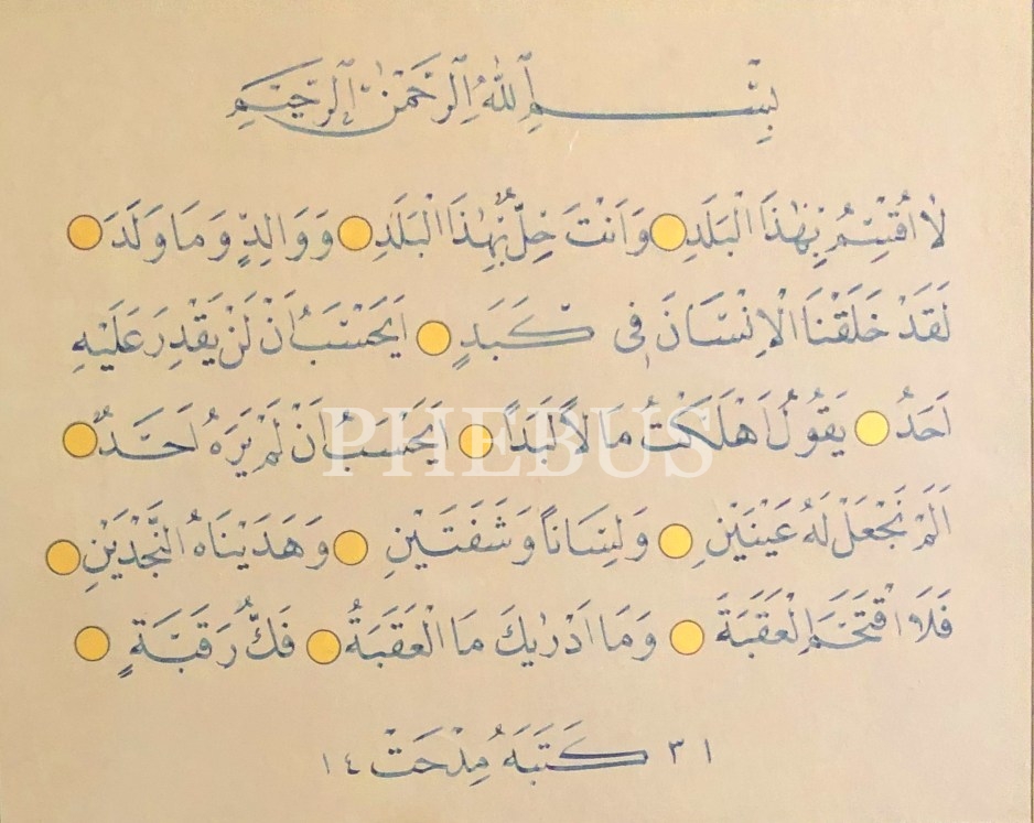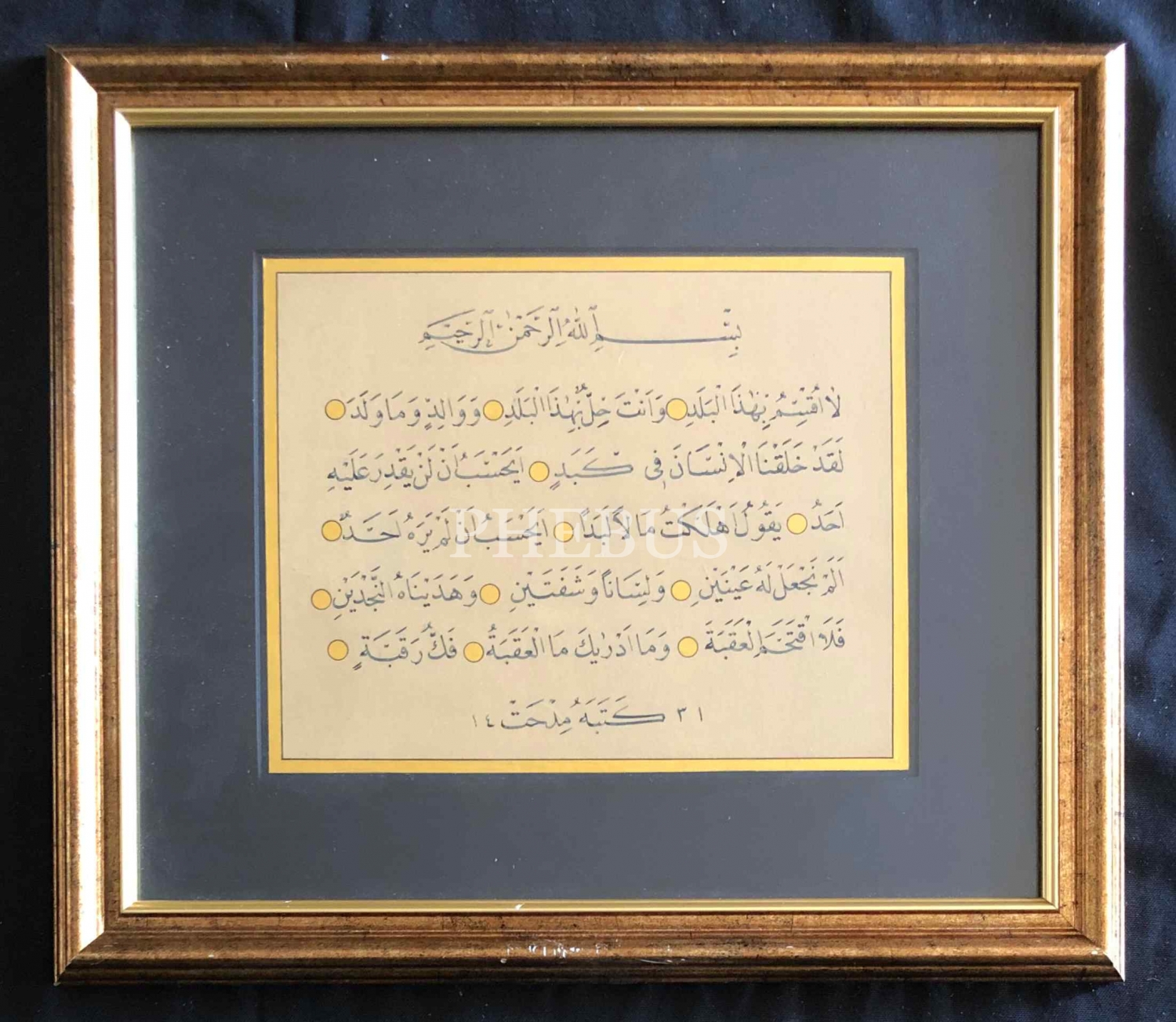 Mithat (Topaç) ketebeli, 1431 tarihli nesih yazı ile Beled Suresi, yazı:20x25 cm