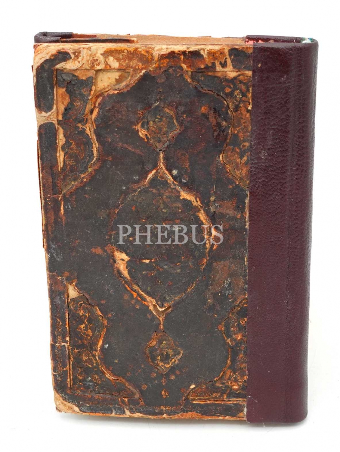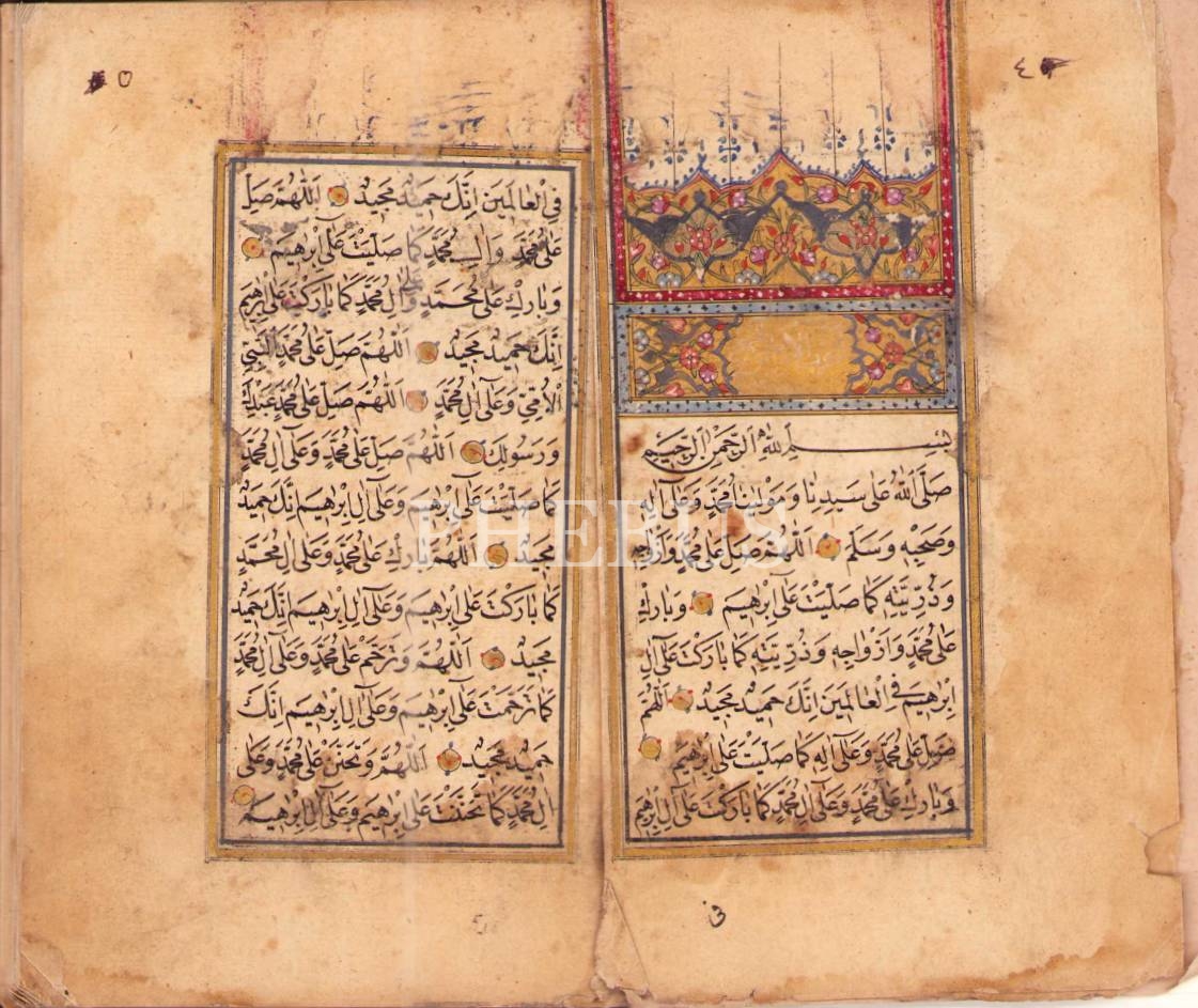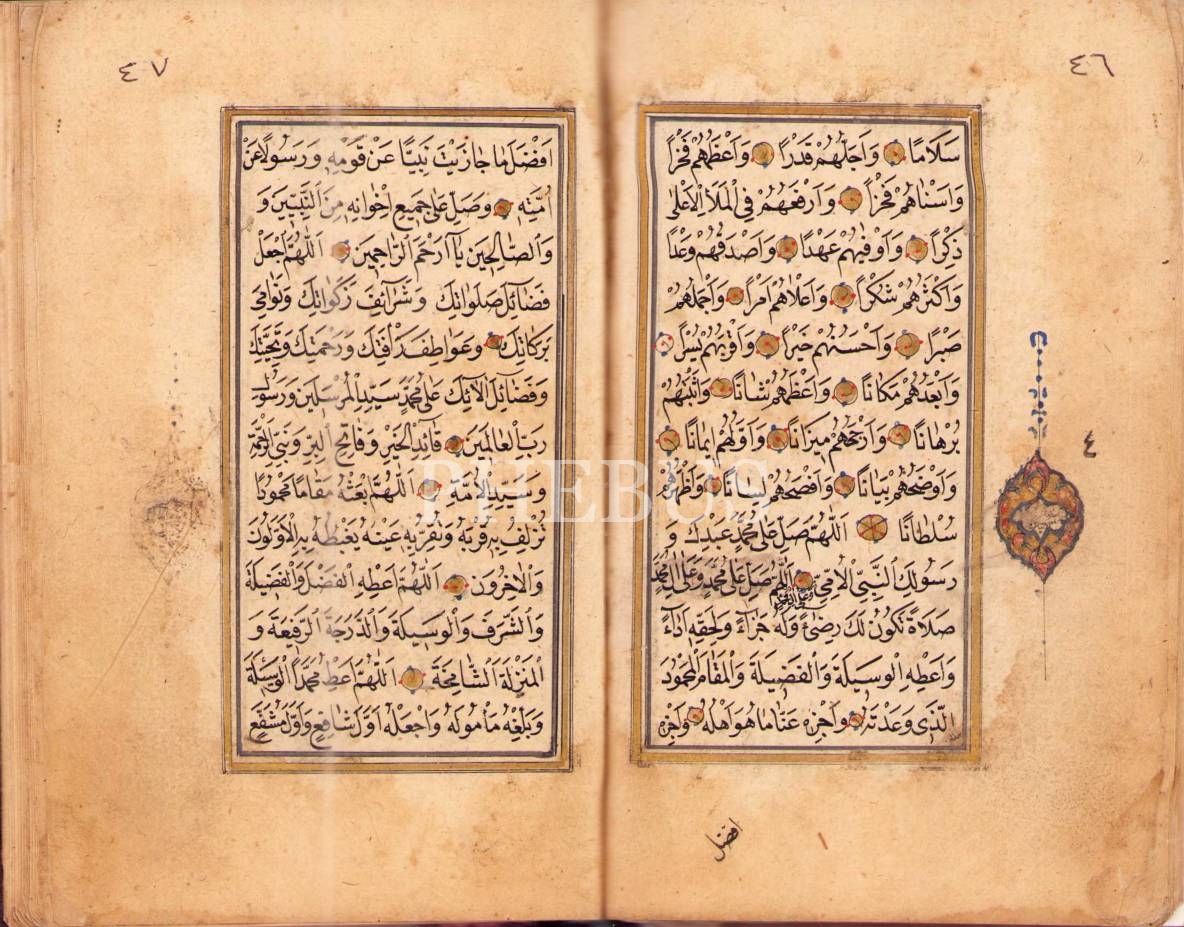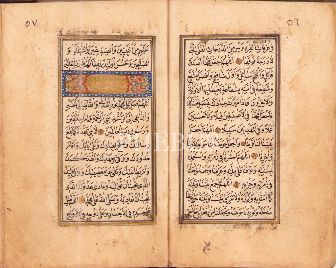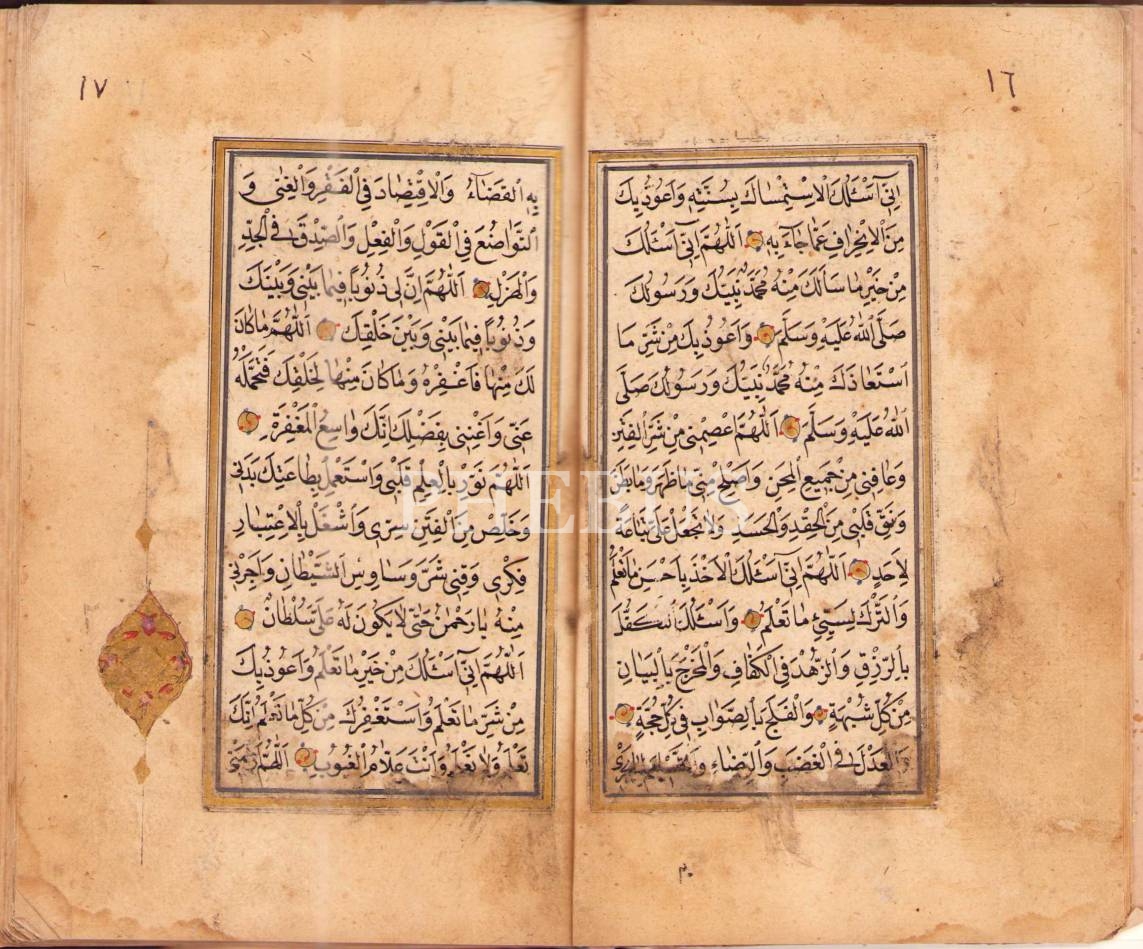 İçerisinde Hz. Muhammed’in kabrinin minyatürü ve minberde bir kandil şeklinde tasvirinin bulunduğu deri cildi mıklepli ve süslemeli el yazması dua mecmuası, 122 sayfa, 11x17 cm