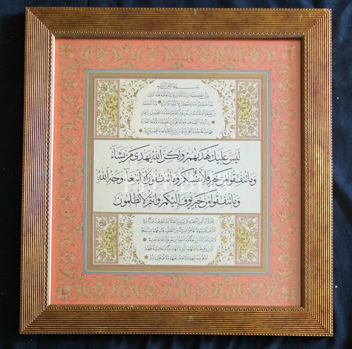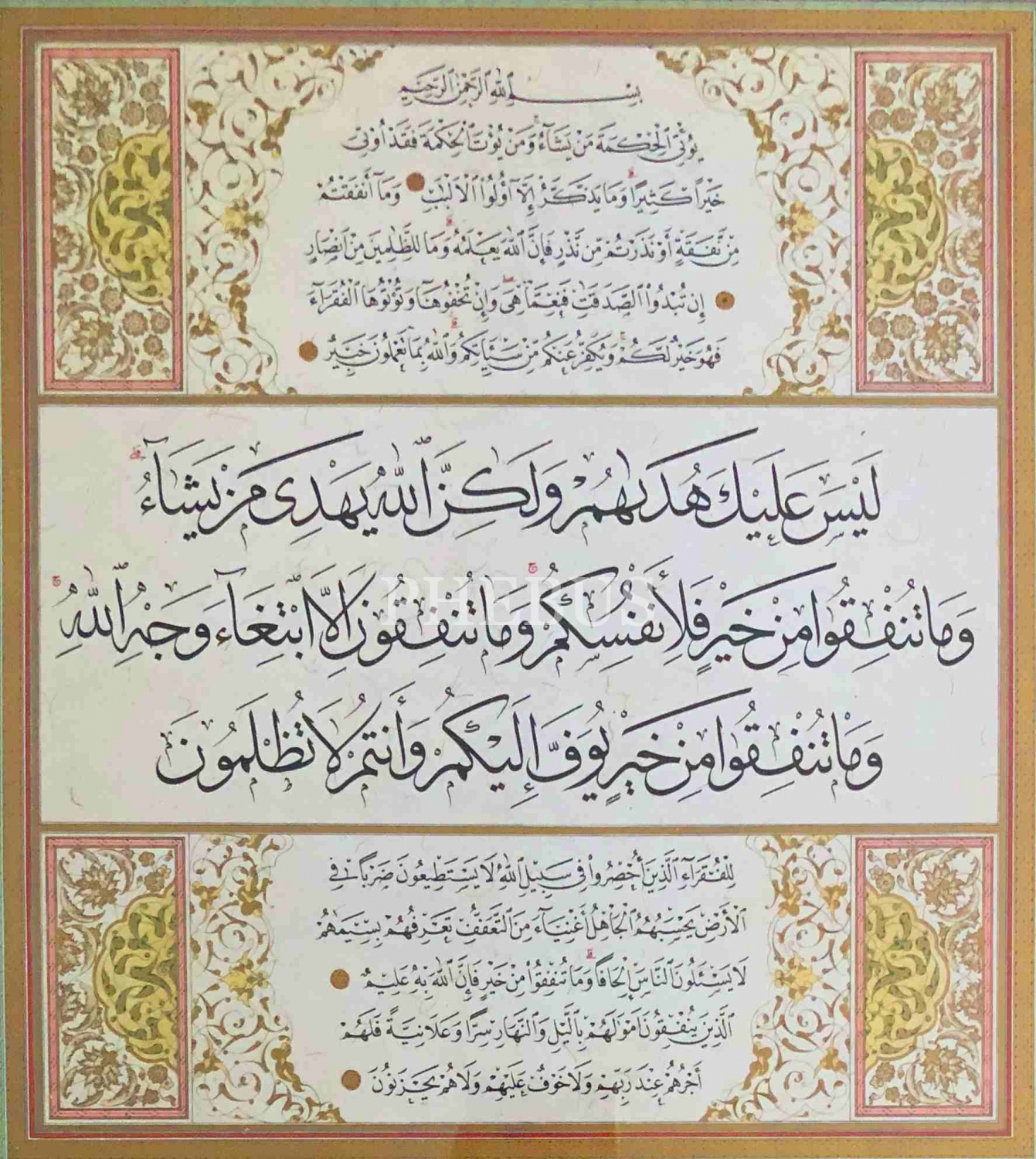 Hoca işi sülüs-nesih hatla Bakara Suresi ayetlerinden oluşan tezhiplenmiş eserin özgün baskısı, 45x48 cm
