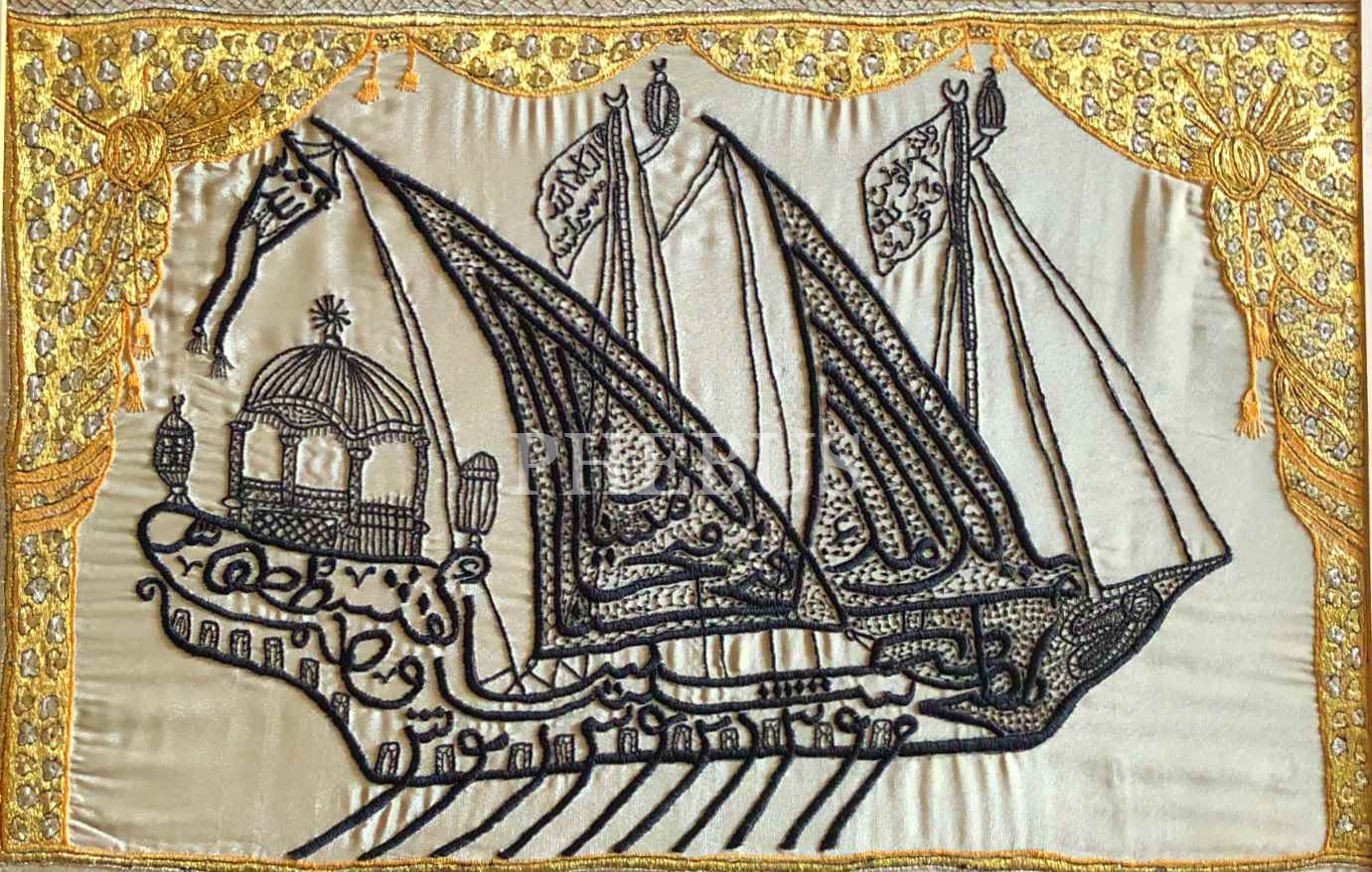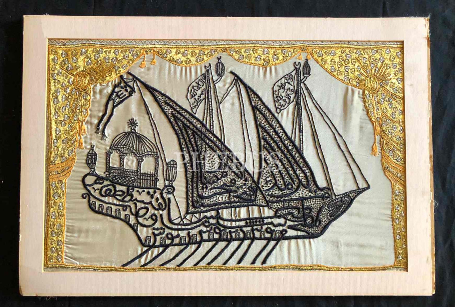 Kumaş üzerine işlenmiş gemi formunda resim yazı, 40x60 cm