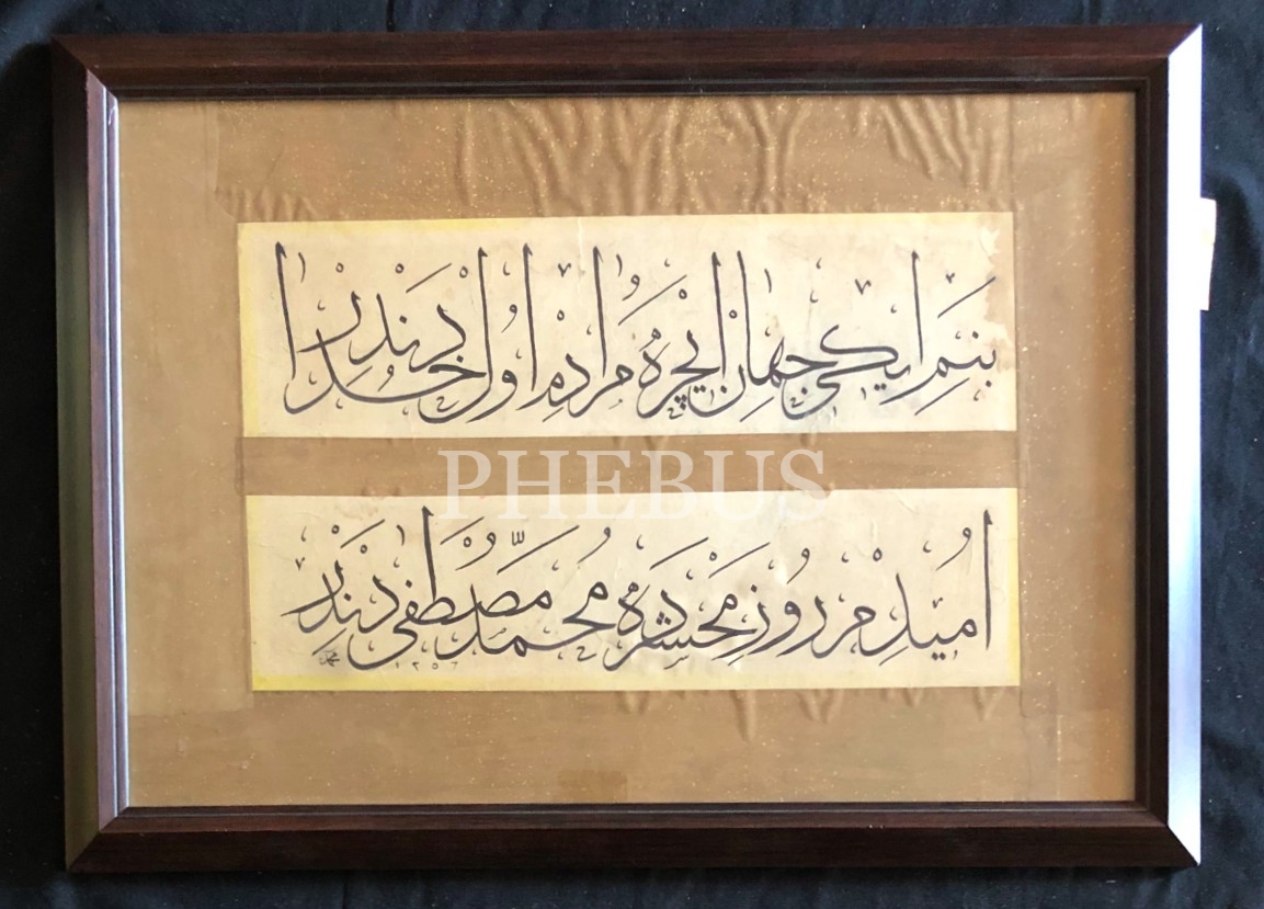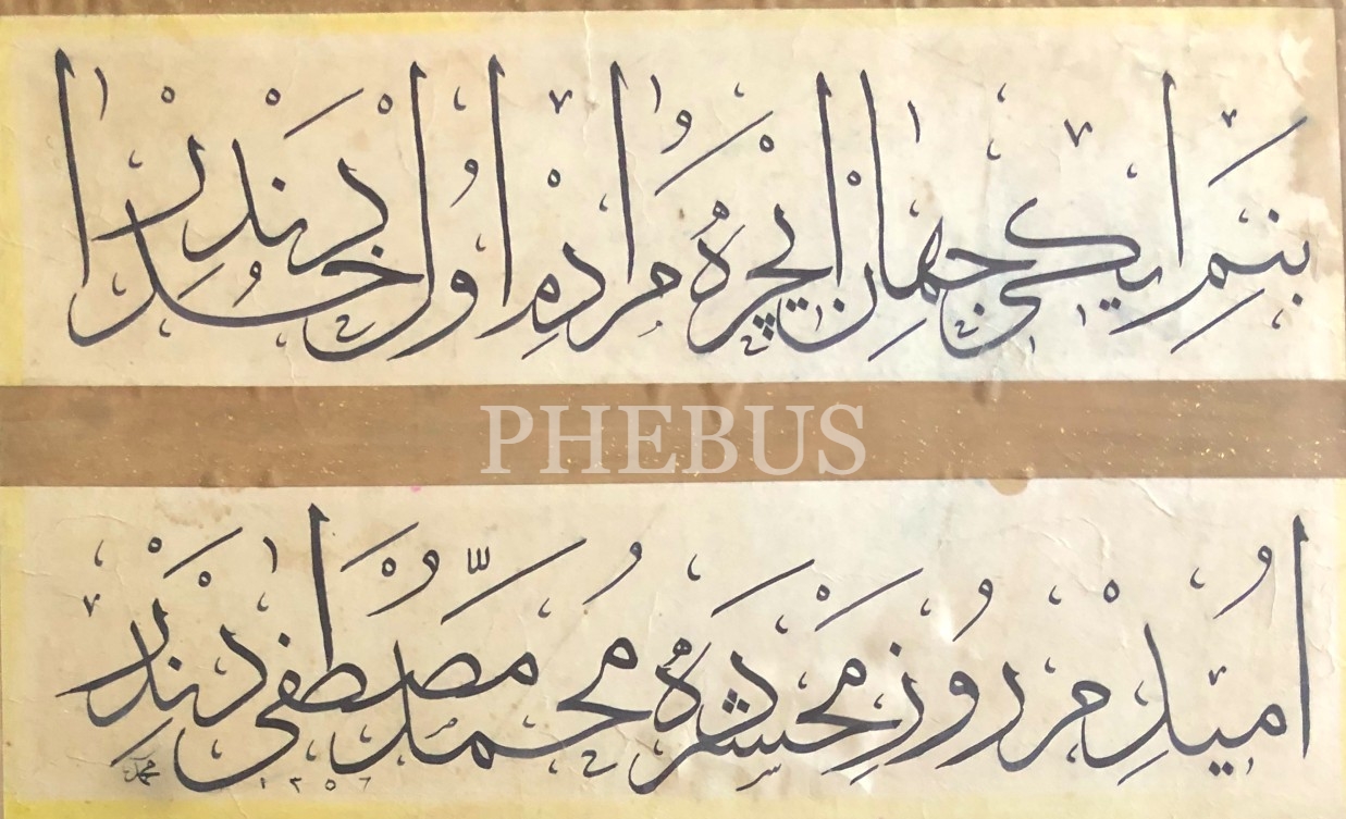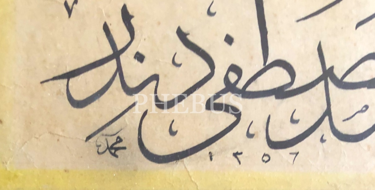 Mehmet ketebeli, 1356 tarihli sülüs yazı ile; “Benim iki cihan içre muradım ol Hüdâ’dandırÜmidim rûzi mahşerde Muhammed Mustafa’dandır”, yazı:25x40 cm