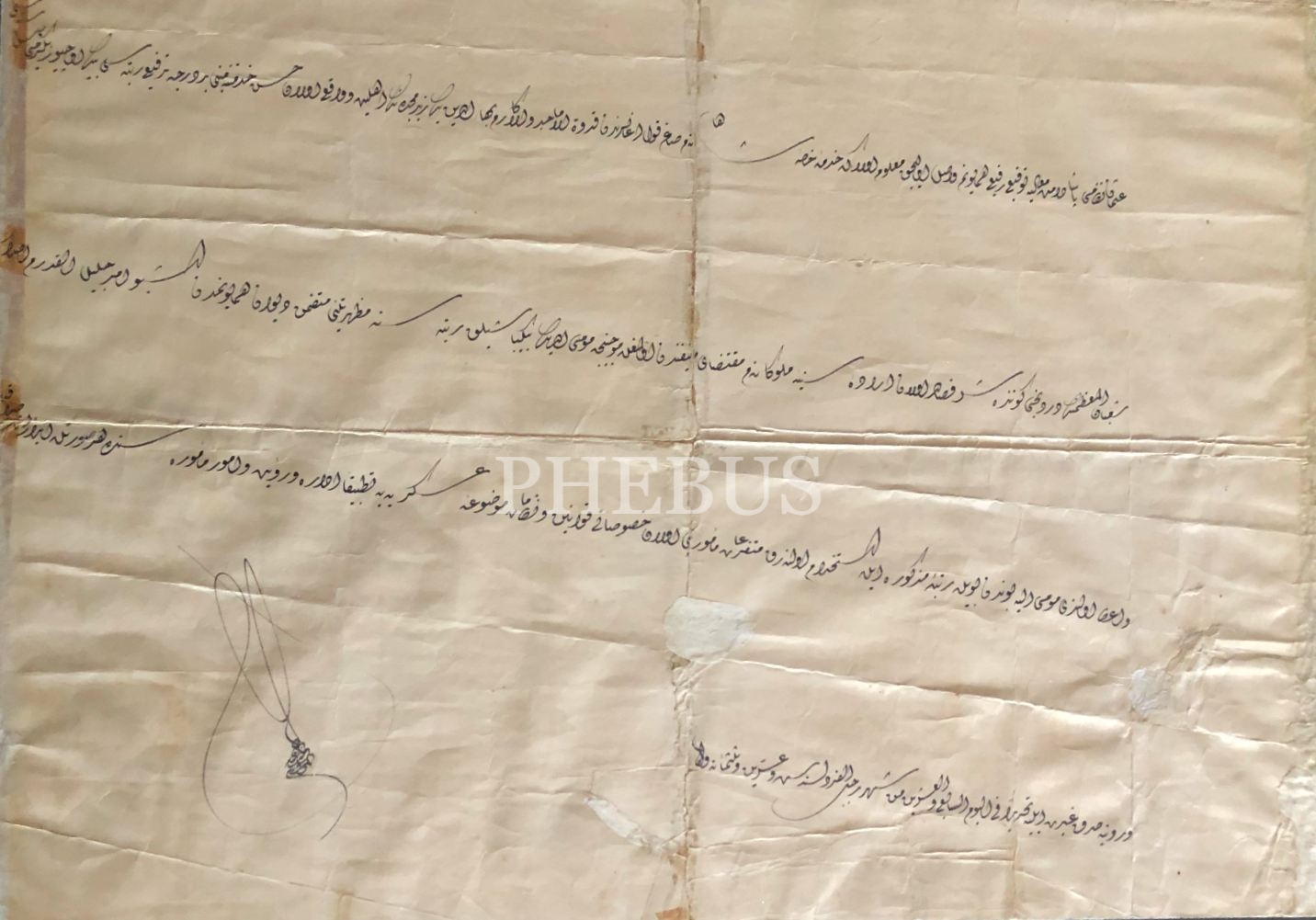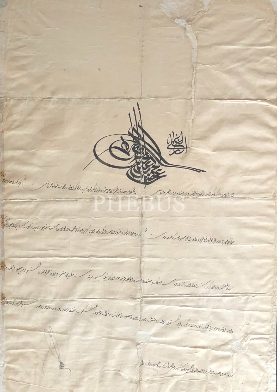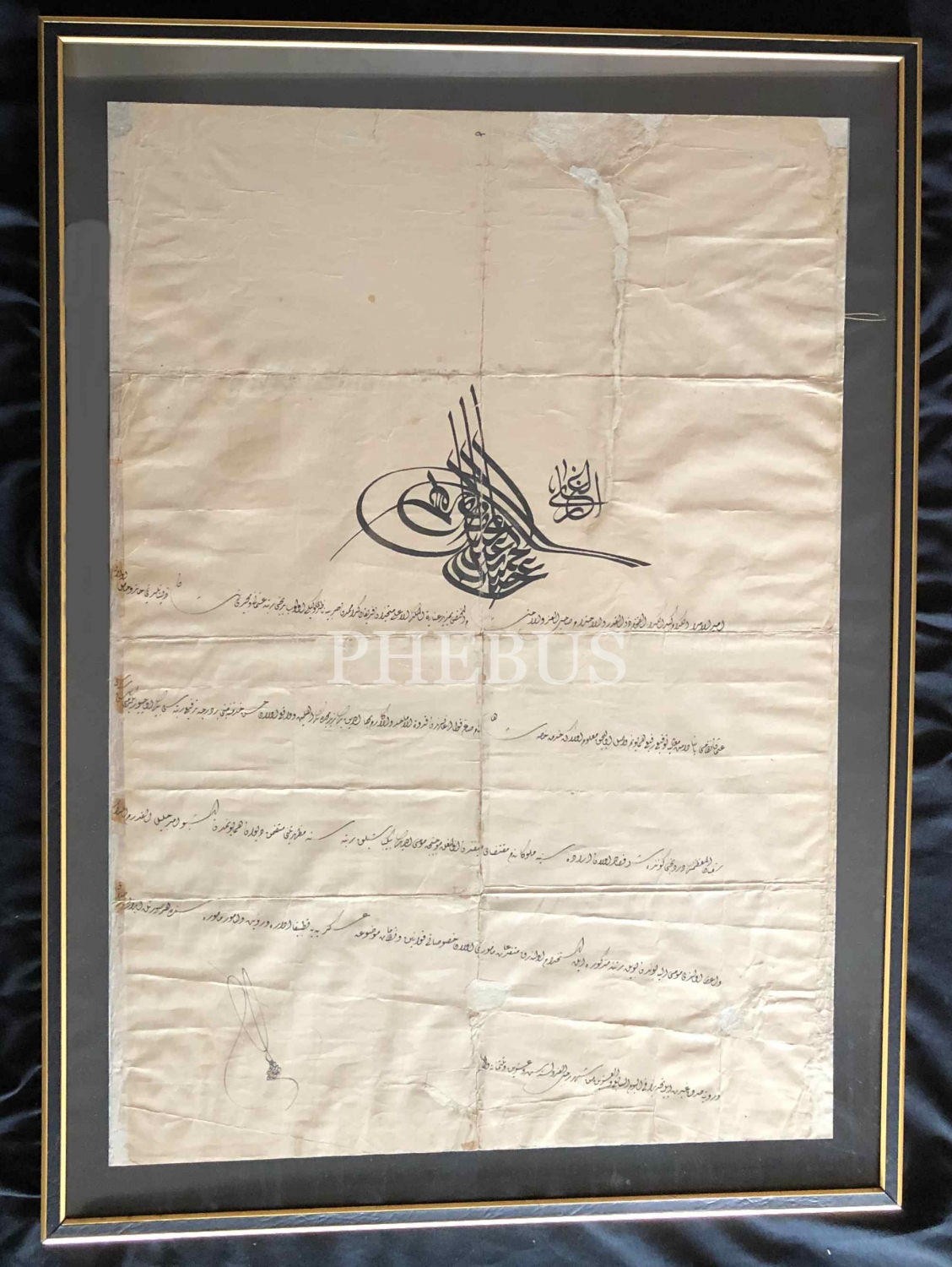 2. Abdülhamit tuğralı, 325 tarihli berat; "Kolağası Bahaeddin Bey´in hüsn-i hizmetine binâen binbaşılık rütbesine terfîsi", 57x81 cm