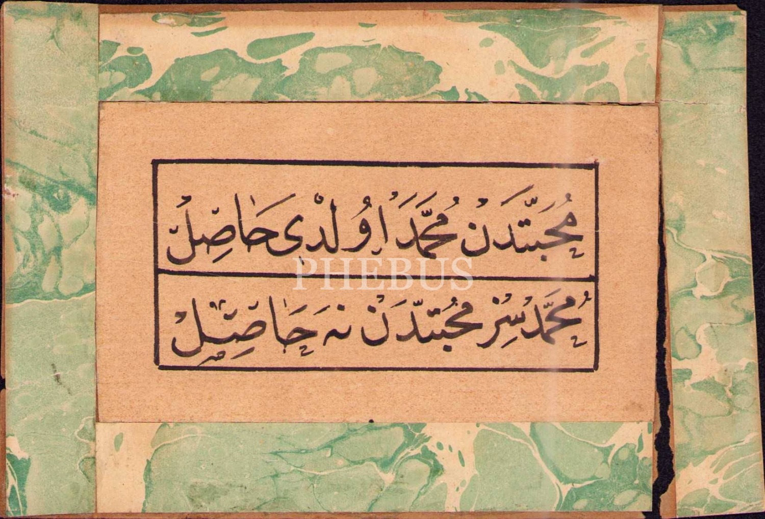Ebru pervazlı nesih yazı ile; "Muhabbetten Muhammed oldu hâsıl, Muhammed´siz muhabbetten ne vâsıl", 10x14 cm