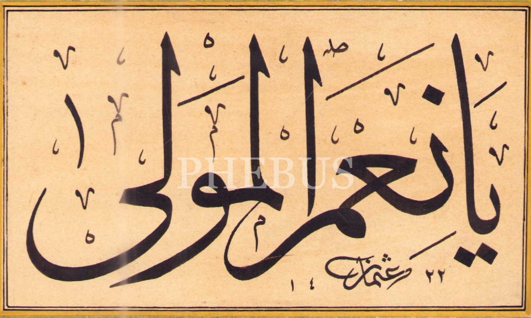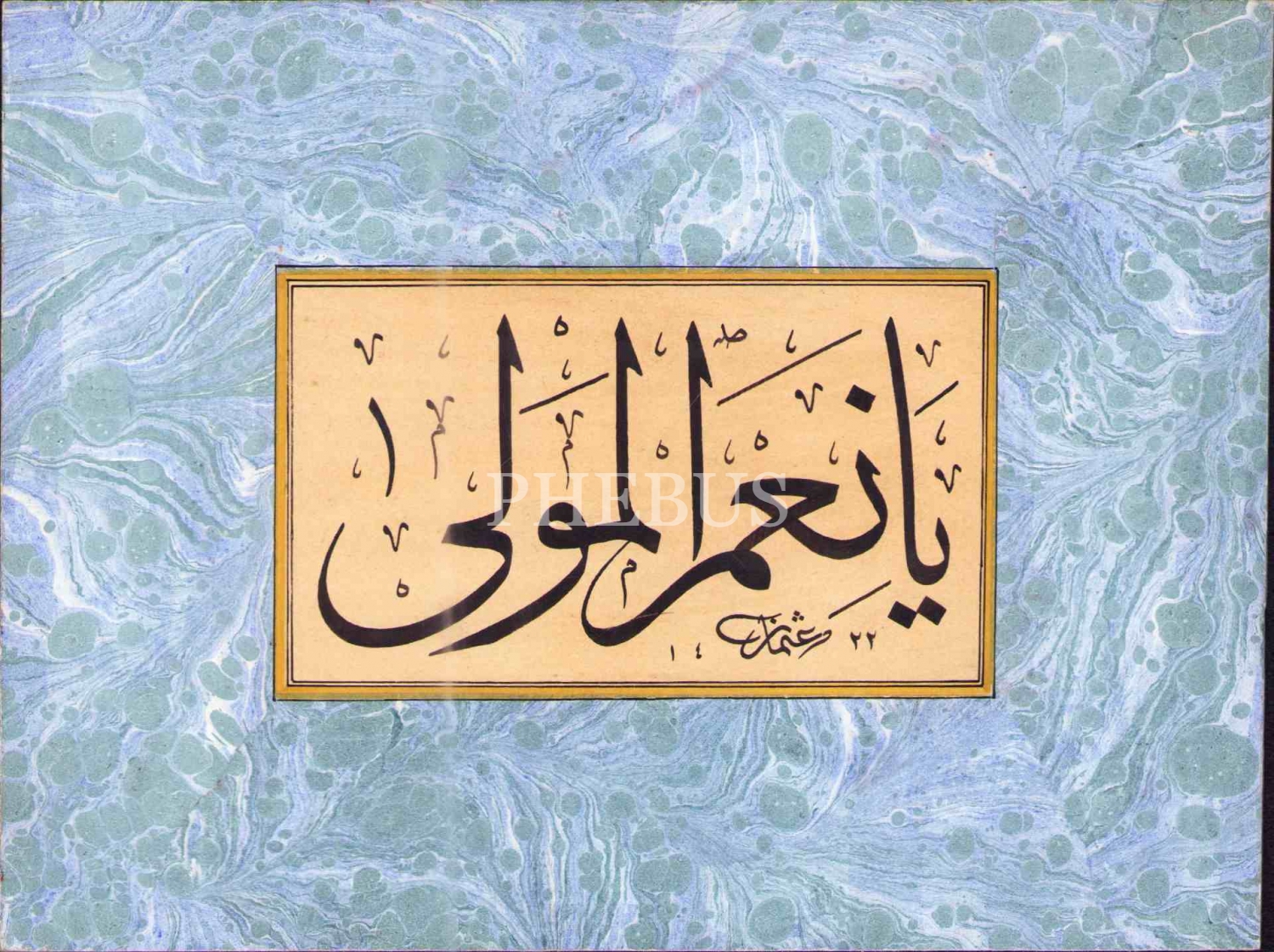 Osman(Yayla) ketebeli ve 1422 tarihli sülüs yazı: "Yâ ni'me'l-Mevlâ", ebru pervazlı, 18x24 cm