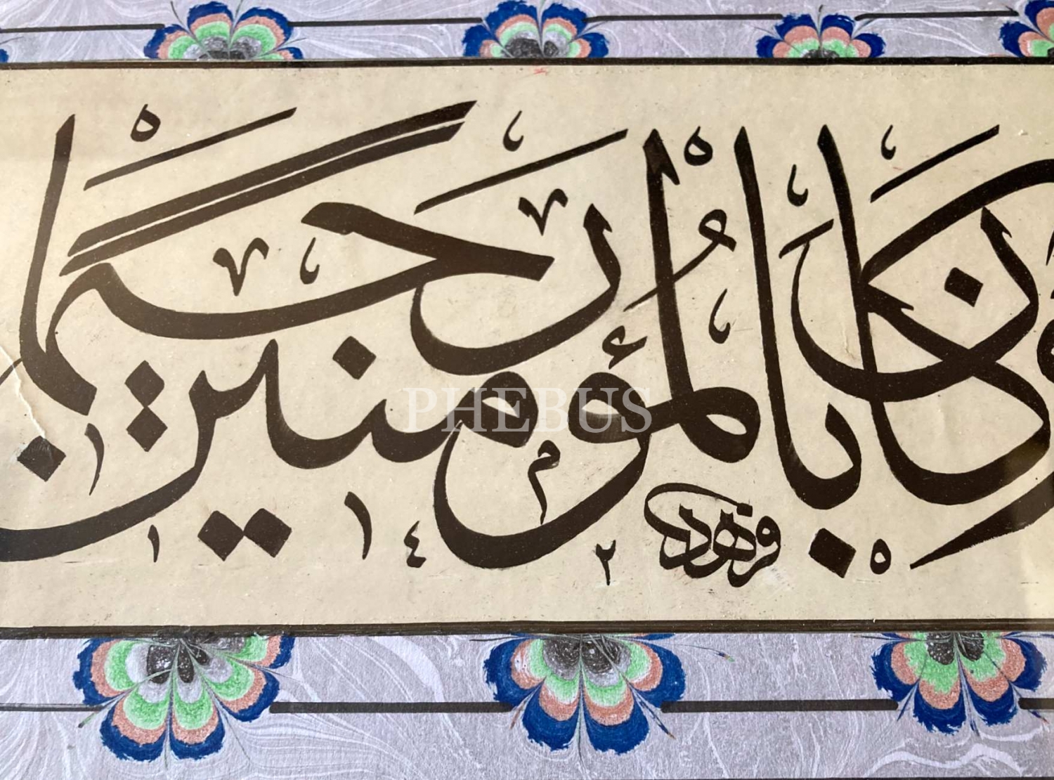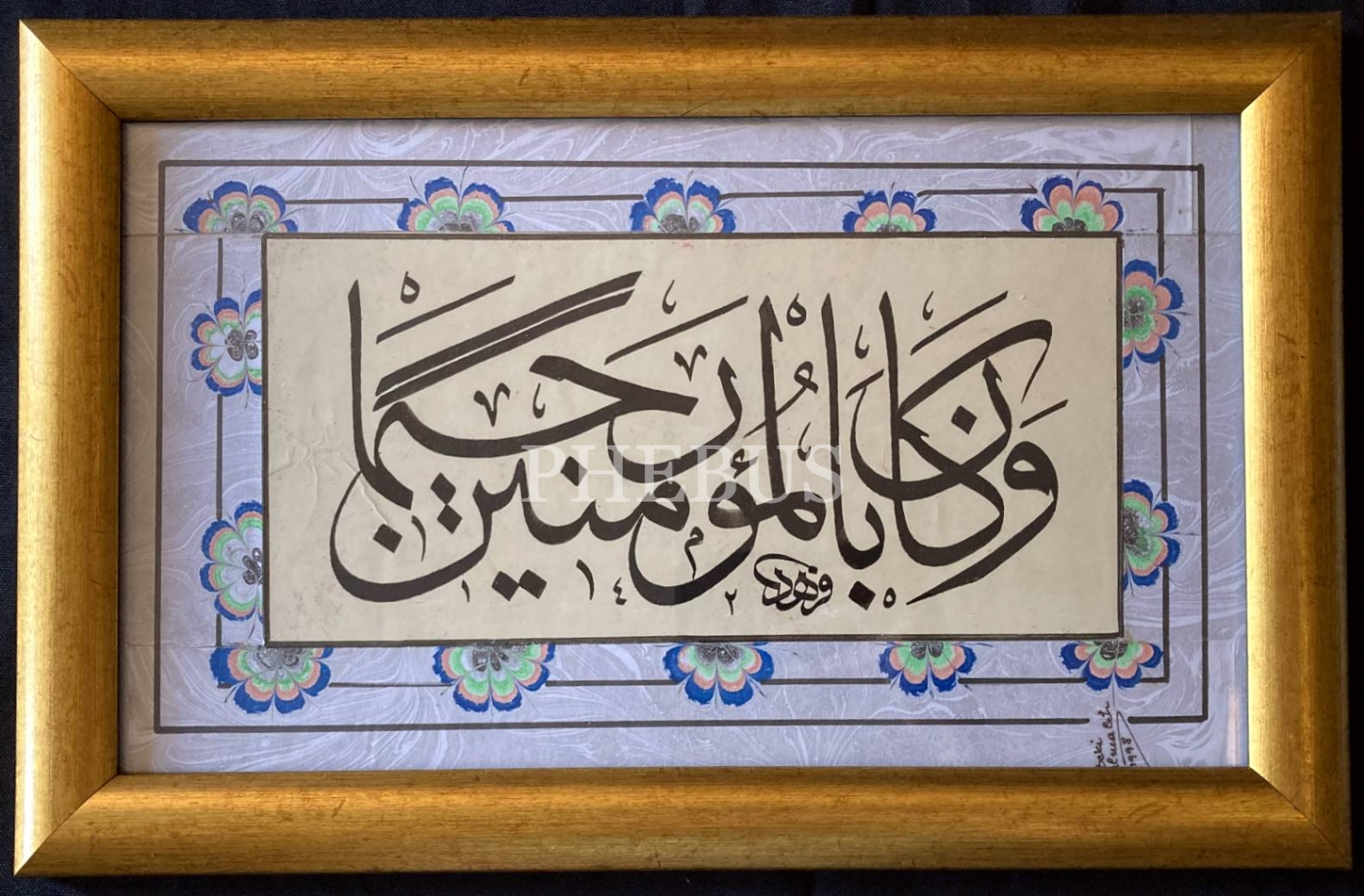 Ferhat(Kurlu) ketebeli, 1425 tarihli celî sülüs yazı ile Ahzap Suresi 43. ayet, ebru pervazlı, yazı:13x27 cm