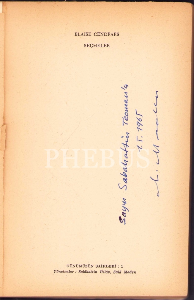 SEÇMELER, Blaise Cendrars (Çev. Sait Maden), 1964, De Yayınevi, 176 sayfa, 13,5 X 20 cm… Sait Maden´den şair Sabahattin Teoman´a imzalı…