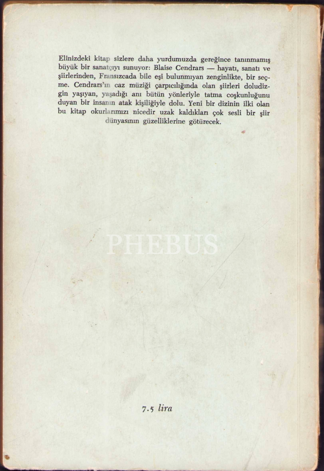 Modernist şiirin öncülerinden Blaise Cendrars´ın (1887 - 1961) şiirlerinin Türkçedeki ilk çevirisi… Çevirmen Sait Maden´den (1931 - 2013) şair Sabahattin Teoman´a imzalı…