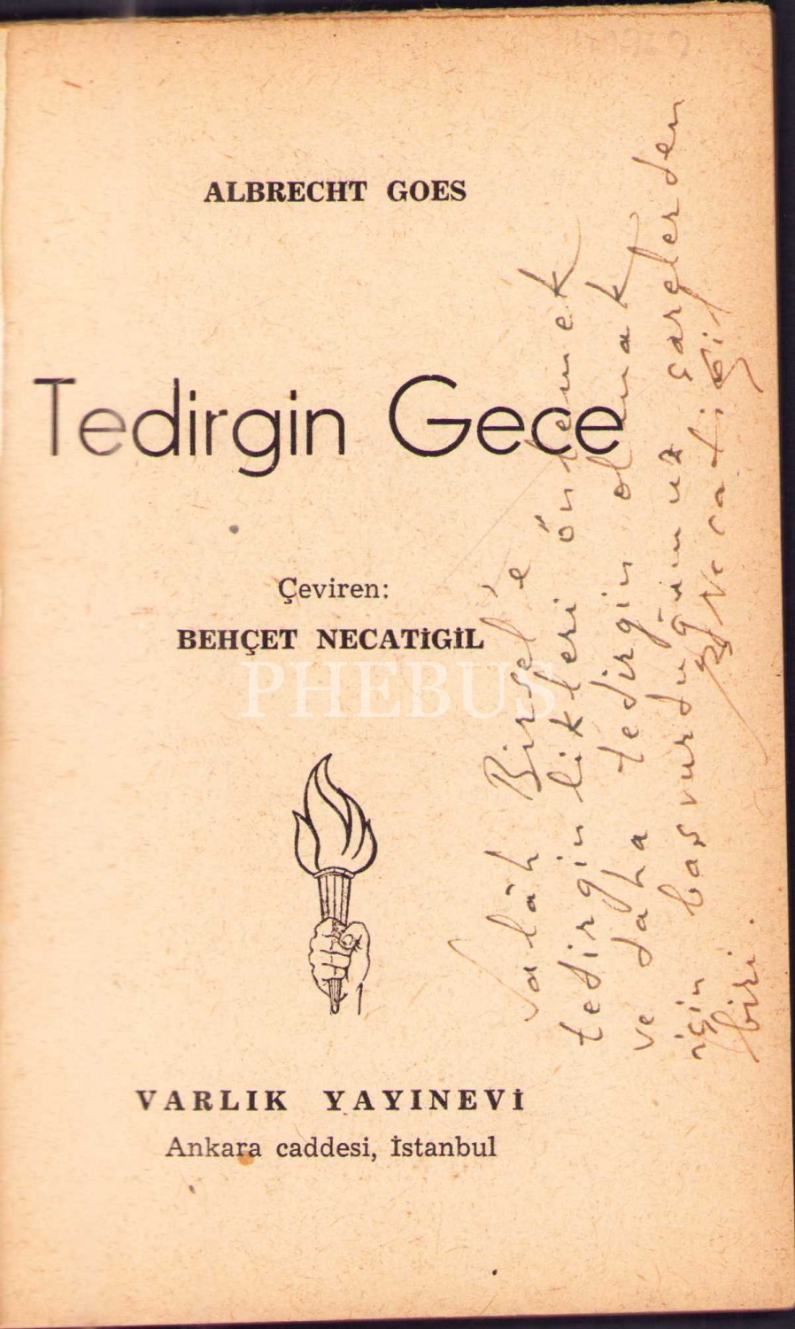 TEDİRGİN GECE, Albrecht Goes (Çev. Behçet Necatigil), 1954, Varlık Yayınları, 92 sayfa, 11,5 X 16,5 cm… Behçet Necatigil´den Salah Birsel´e imzalı…