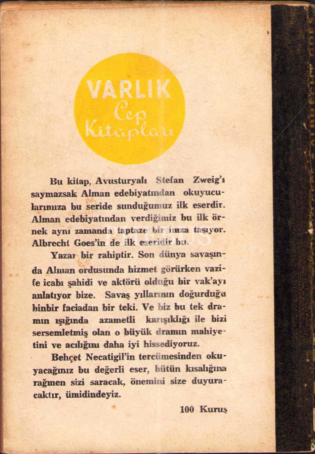 Aynı zamanda Protestan bir rahip olan Alman yazar Albrecht Goes´in (1908 - 2000), II. Dünya Savaşı´nda tanık olduğu bir faciayı ele aldığı bu romanı; şiirlerinin, radyo oyunlarının, referans kitaplarının, deneme ve eleştilerinin yanı sıra, çevirileriyle de Türkçeye çok sayıda eser kazandıran Behçet Necatigil (1916 - 1979) tarafından, şair ve denemeci Salah Birsel'e "tedirginlikleri önlemek ve daha tedirgin olmak için başvurduğumuz çarelerden biri" ithafıyla imzalanmış.