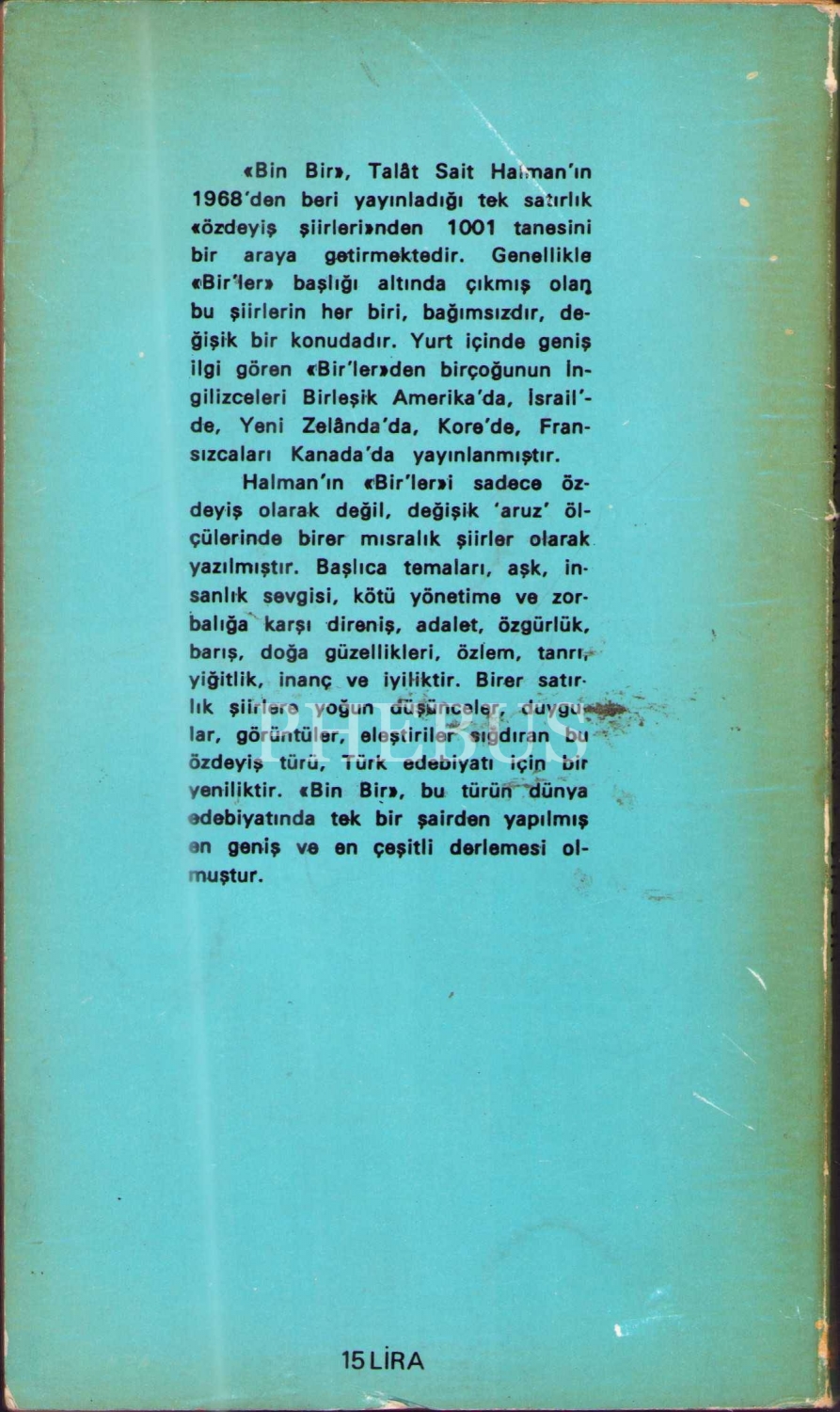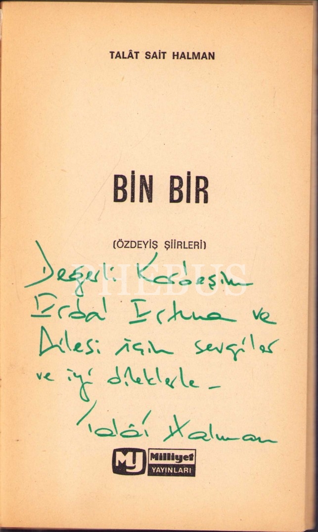 BİN BİR (Özdeyiş Şiirleri), Talat Sait Halman, tarihsiz, Milliyet Yayınları, 112 sayfa, 11 X 19 cm… İthaflı ve imzalı…