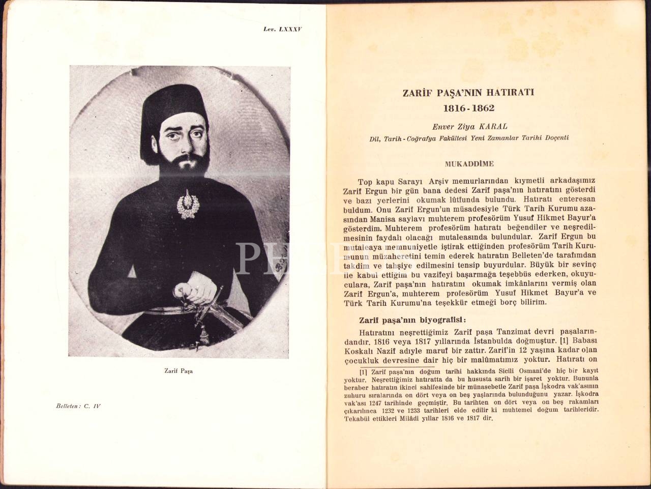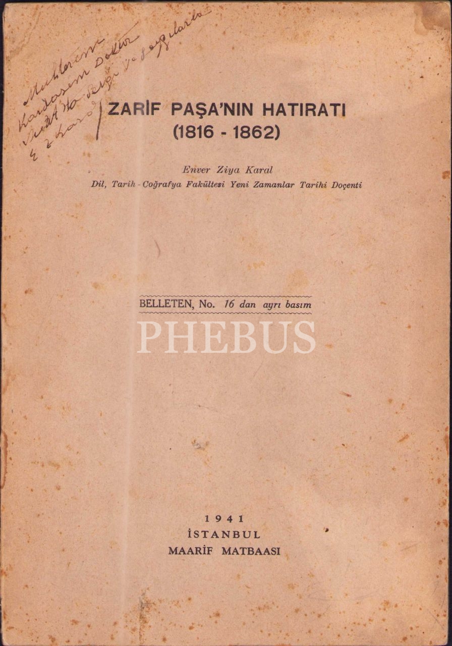 Tarihçi ve Akademisyen Enver Ziya Karal’ın (1908 – 1982), ilginç bir Osmanlı paşası olan Mustafa Zarif Paşa´nın hatıralarını yayımladığı 16 numaralı Belleten´den ayrı basım… Kapak üstüne imzalı...