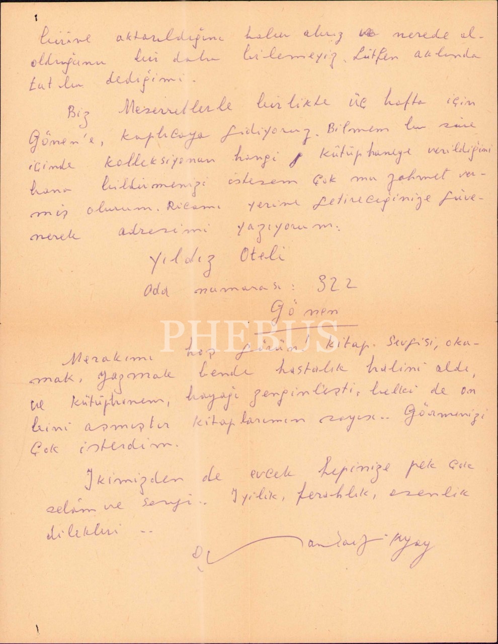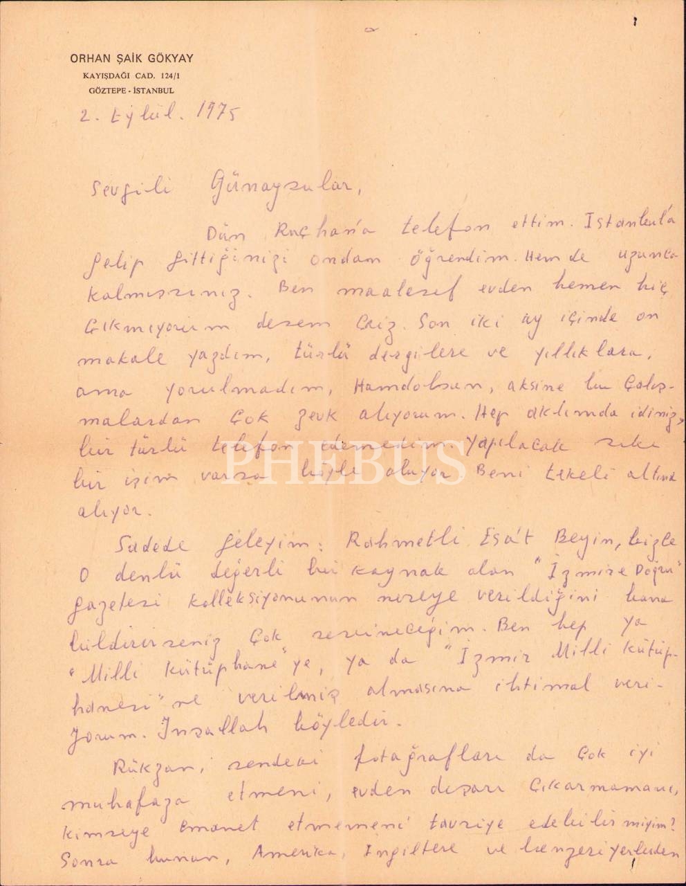 Daha çok “Bu Vatan Kimin” şiiri ile hatırlanmasına karşın, şairliğinden çok, eleştirmenliği ve araştırmacılığıyla Türk edebiyatına çok büyük katkılar sağlamış olan Orhan Şaik Gökyay´ın (1902 - 1994), TED Ankara Koleji´nin efsane edebiyat öğretmeni Rüksan Günaysu´ya yazılmış mektup... "... Kitap sevgisi, okumak, yazmak bende hastalık halini aldı ve kütüphanem bayağı zenginleşti. Belki de on bini aşmıştır kitaplarımın sayısı..." Orhan Şaik Gökyay antetli zarf içinde...