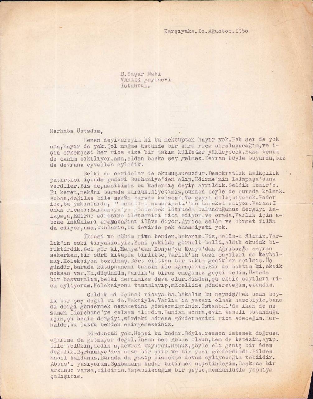 Şair, romancı, yayıncı, senarist, düşünür, denemeci, eleştirmen ve gazeteci Attila İlhan´ın (1925 - 2005); Varlık dergisi ve Varlık Yayınları sahibi Yaşar Nabi Nayır´a (1908 - 1981) yazdığı ve birtakım ricalarda bulunduğu mektup… "Merhaba Üstadım, Hemen deyivereyim ki bu mektupta hayır yok. Pek şer de yok ama hayır da yok… Size böyle betsiz bereketsiz bir mektup gönderdiğim için kusuruma bakmayın..."