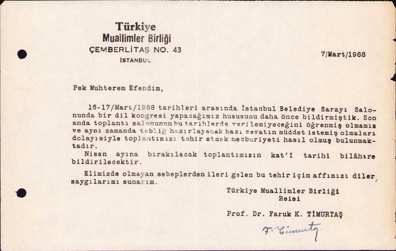 Dil bilgini ve yazar Faruk Kadri Timurtaş´ın (1925 - 1982) Türkiye Muallimler Birliği Reisi olarak gönderdiği, bir kongrenin ertelendiğini bildiren mektup…