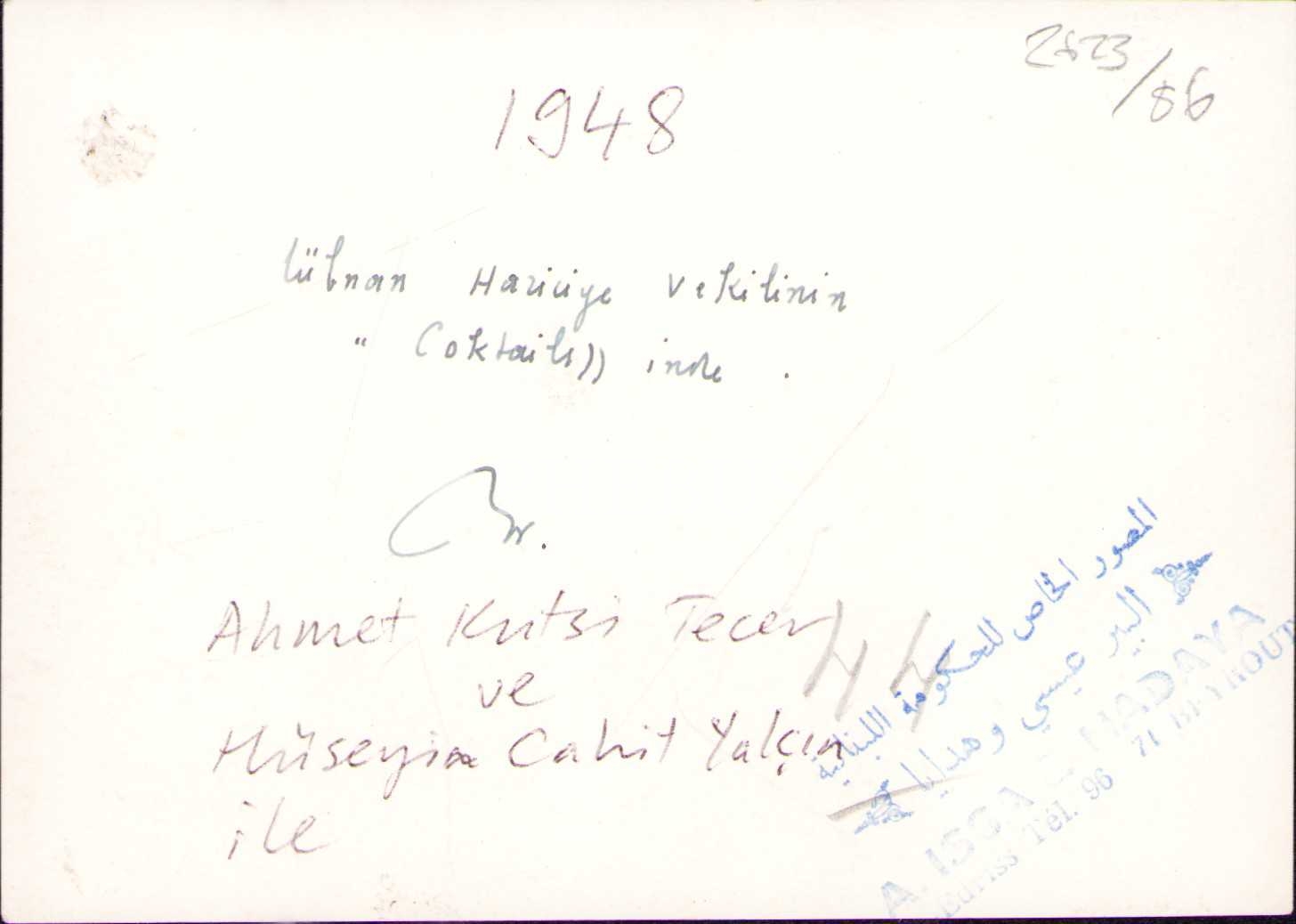 Eski Servet-i Fünuncu, İttihatçı ve gazeteci Hüseyin Cahit Yalçın 1875 - 1957); eğitimci, halkbilimci, yazar ve şair Ahmet Kutsi Tecer (1901 – 1967) ve akademisyen, çevirmen ve yazar Bedrettin Tuncel (1910 - 1980) Lübnan Hariciye Vekili tarafından verilen bir kokteylde...