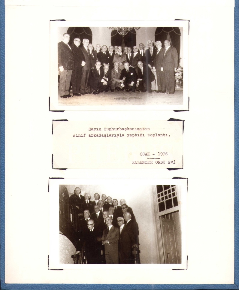 Türkiye´nin 6. Cumhurbaşkanı Fahri Korutürk´ün (1903 - 1987), Ocak 1976´da Kalender Orduevi´nde sınıf arkadaşlarına verdiği davet sonrasında çekilen toplu fotoğraflar… Cumhurbaşkanlı forsu damgalı, mavi deri kaplı cilt kapağı içinde…