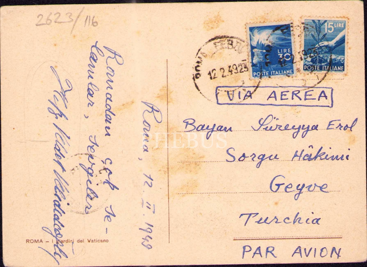 Hukukçu, akademisyen, yazar ve gazeteci Hıfzı Veldet Velidedeoğlu´nun (1904 - 1992) Roma´dan gönderdiği, 1949 tarihli bir tebrik kartı...