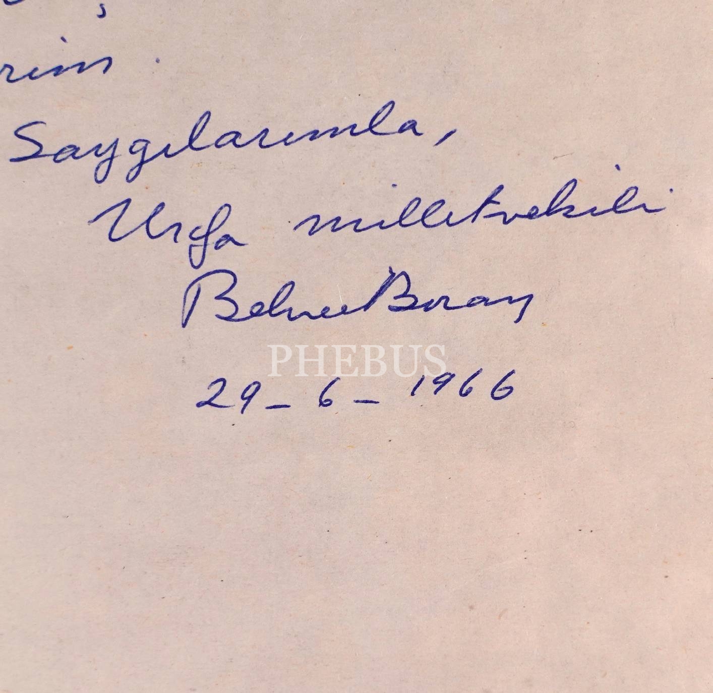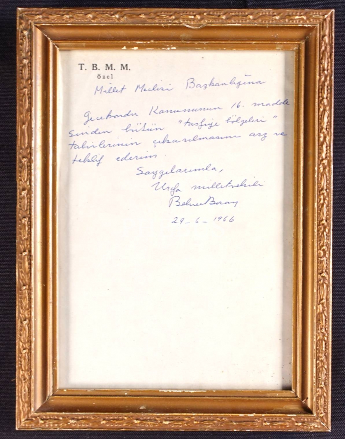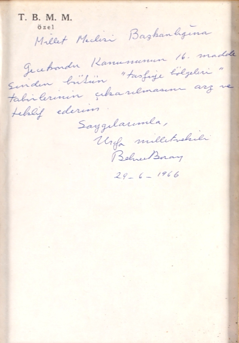 12Eylül´de kapatılan Türkiye İşçi Partisinin son genel başakanı, Türkiye sosyalist hareketinin simge isimlerinden Behice Boran´ın, Urfa milletvekili olarak mecliste bulunduğu 1966 yılında verdiği bir önerge: "Gecekondu Kanunu´nun 16. maddesindeki bütün "tasfiye bölgeleri" tabirlerinin çıkarılmasını arz ve talep ederim." / Eski ahşap çerçeve içinde... (Çerçeve boyutları: 18 X 24 cm...)