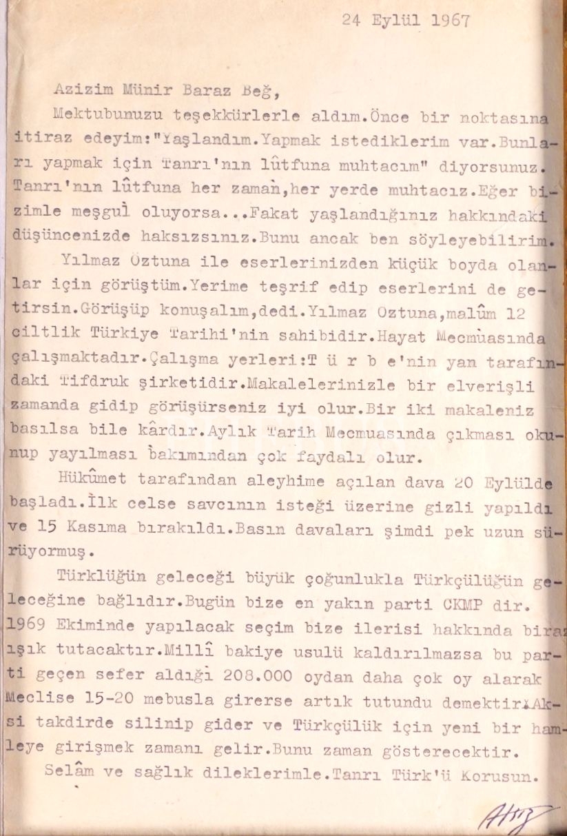 NİHAL ATSIZ İMZALI, 24 EYLÜL 1967 TARİHLİ MEKTUP, 16 X 23 cm...