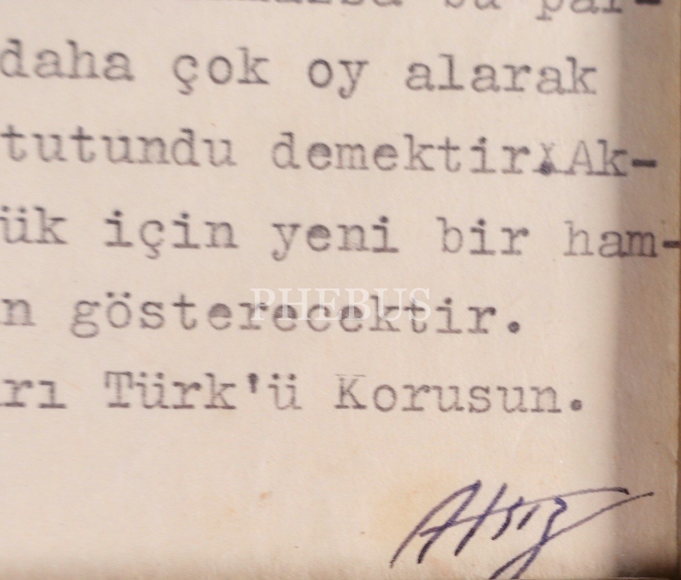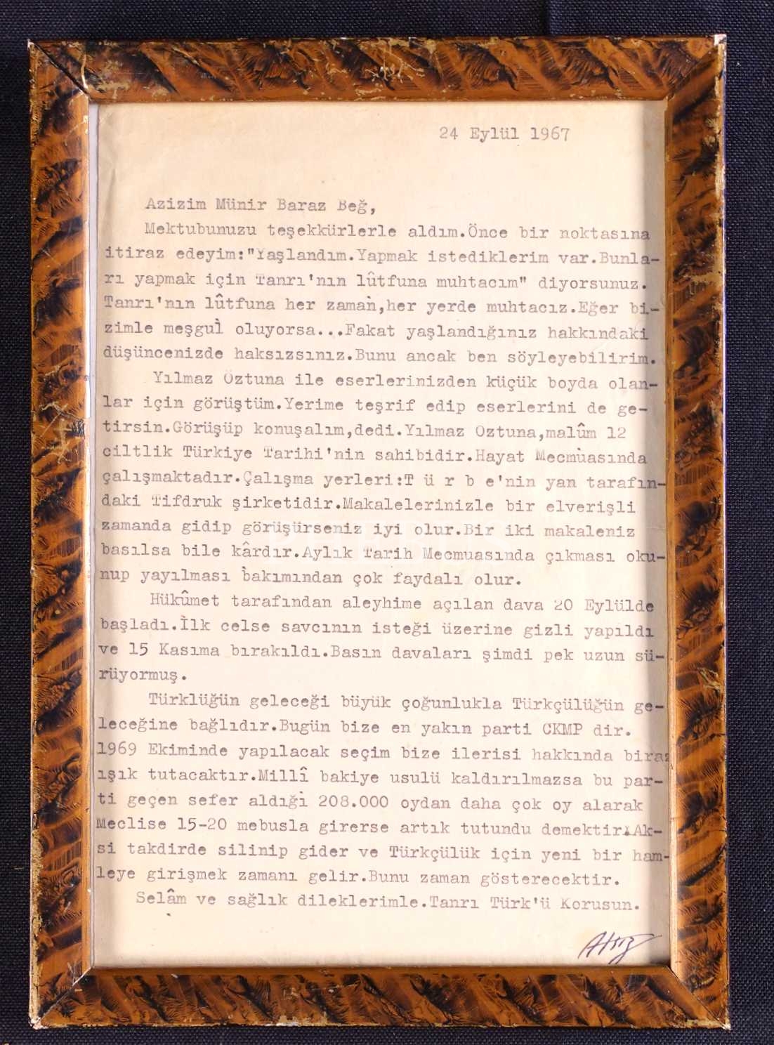 Türkçülük – Turancılık fikriyatı ve hareketinin, tartışmasız en önde gelen ismi olan Nihal Atsız´ın (1905 – 1975), "Yaşlandım, yapmak istediklerim var. Bunları yapmak için Tanrı´nın lutfuna muhtacım, diyorsunuz. Tanrı´nın lutfuna her zaman, her yerde muhtacız. Eğer bizimle meşgul oluyorsa... Türklüğün geleceği büyük çoğunlukla Türkçülüğün geleceğine bağlıdır. Bugün bize en yakın parti CKMP´dir..." / Eski ahşap çerçeve içinde... (Çerçeve boyutları: 17,5 X 24,5 cm...)
