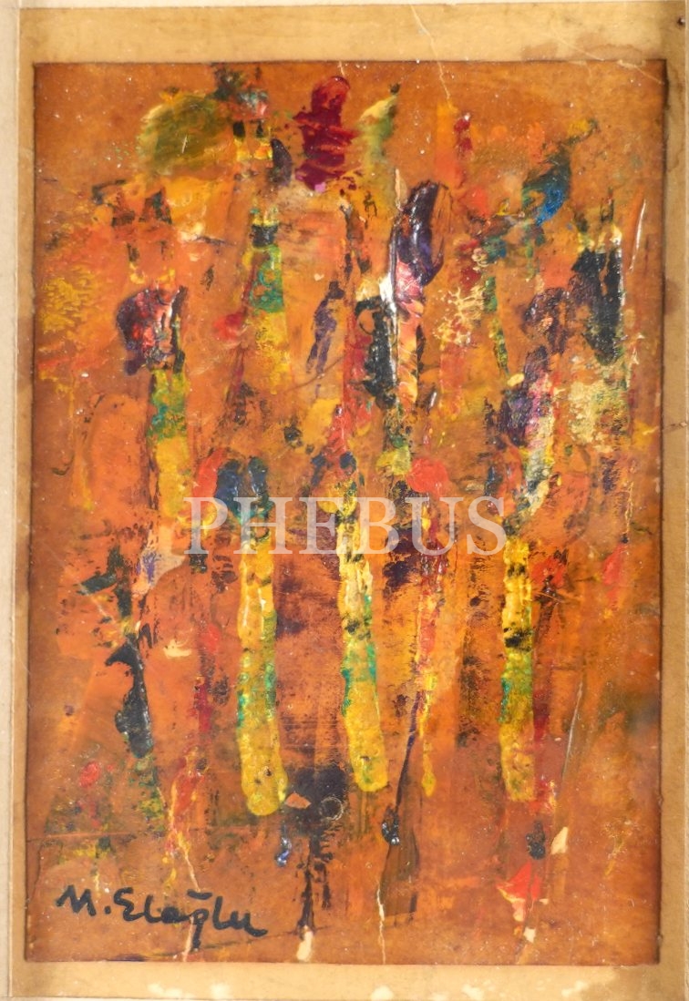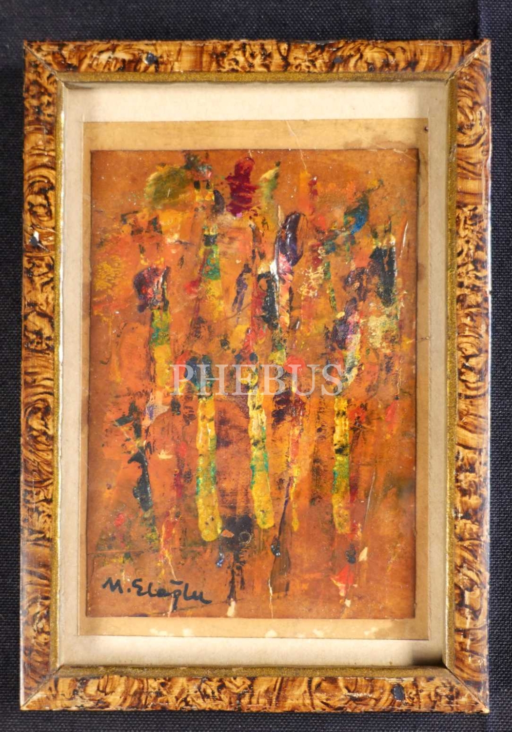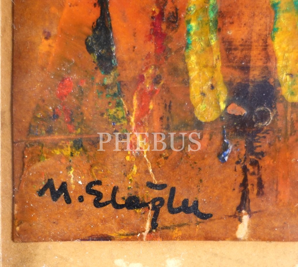 Şiire, Garip şiirine yakın bir anlayışla, sokak dilini ustaca kullanarak başlayan ve giderek II. Yeni´ye yaklaşan Metin Eloğlu (1927 - 1985) ressam olarak da lekeci bir anlayışla soyut ve figüratif çalışmalar yaptı. Çok sayıda sergi açtı ve çok sayıda ödül aldı. / Eski ahşap çerçeve içinde... (Çerçeve boyutları: 12,5 X 18 cm)...