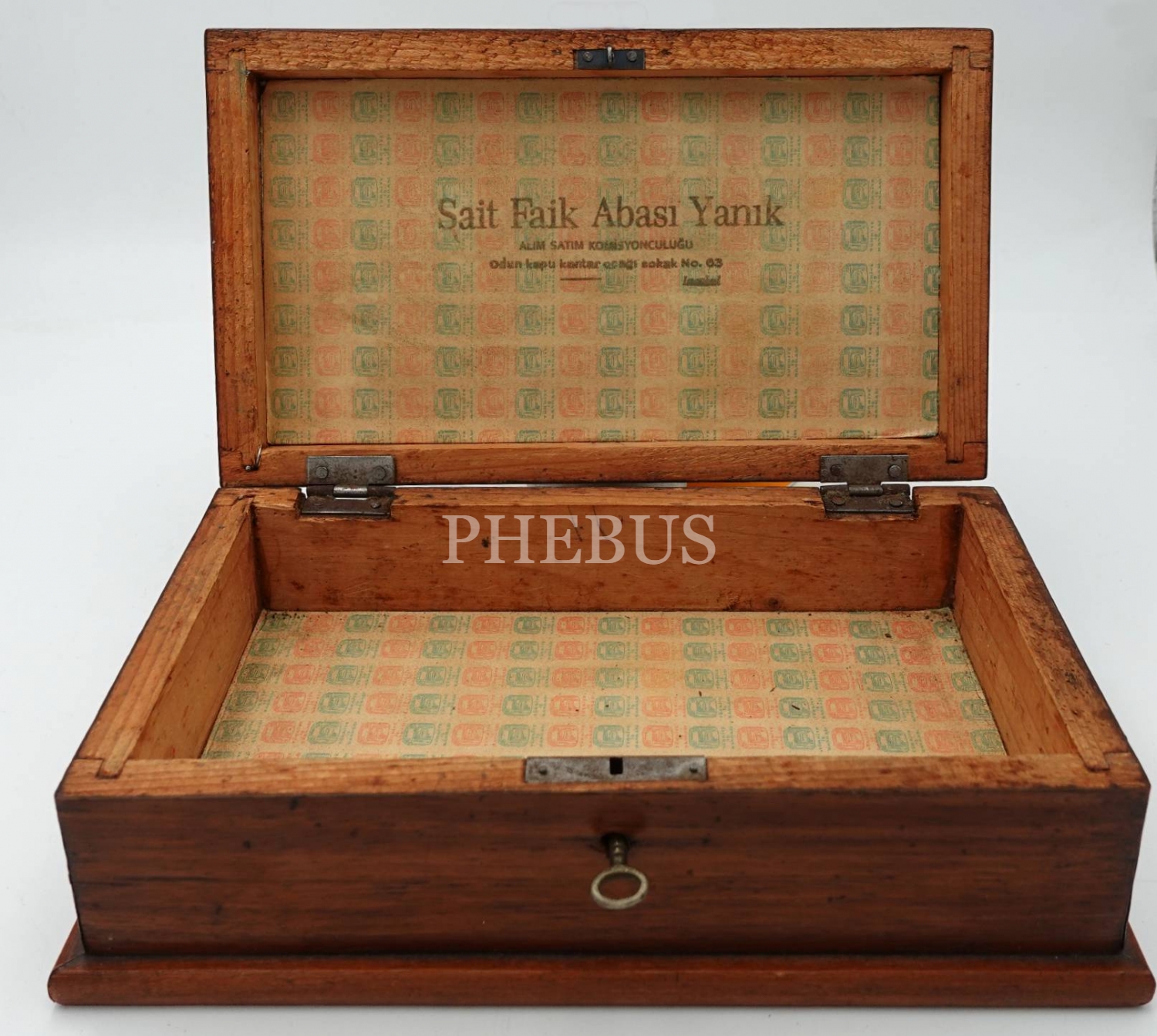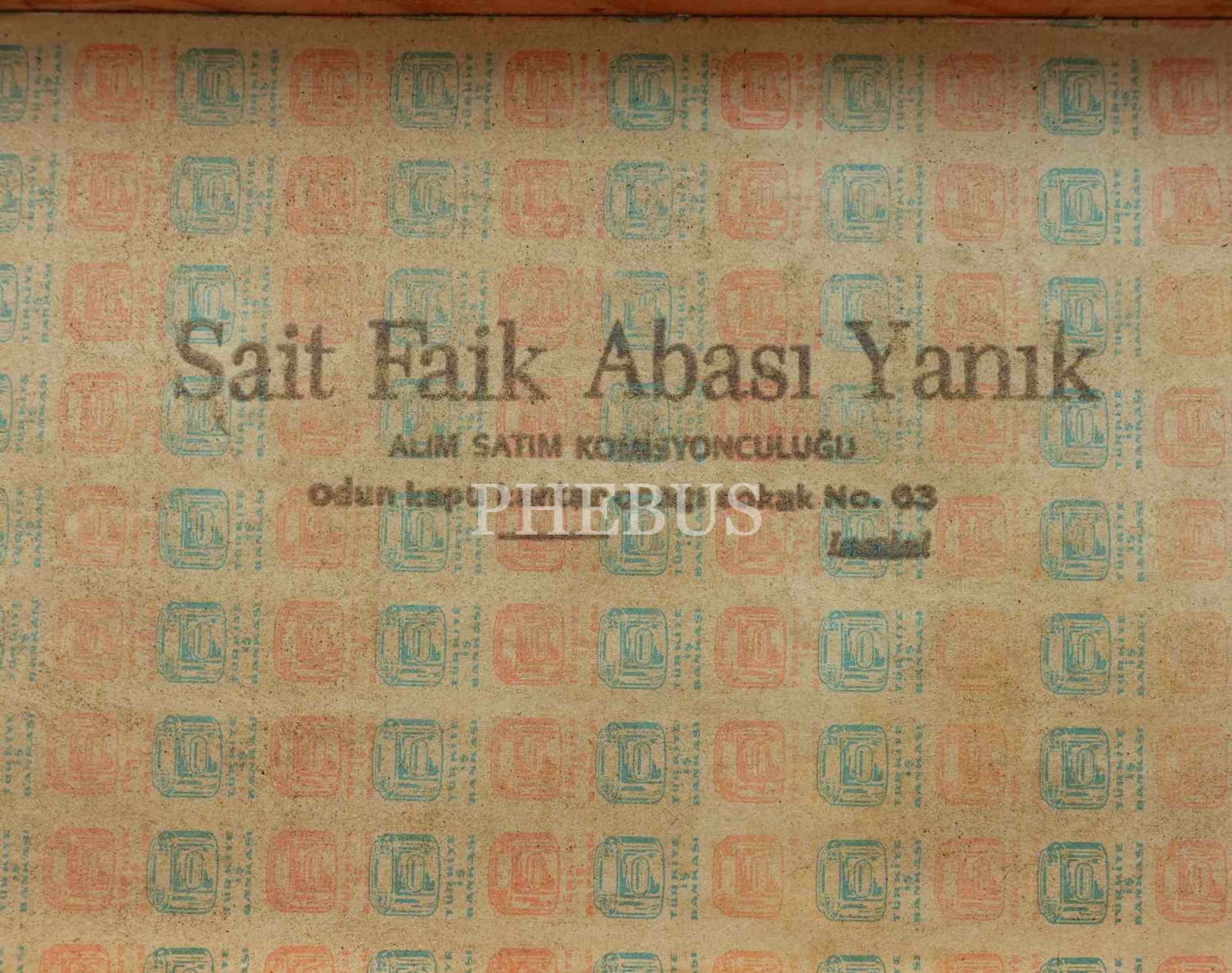 Modern hikâyeciliğimizin en önemli ismi olan Sait Faik (1906 – 1954), hikâyelerinde, anlattığı balıkçılar, kahveciler, işsizler, yoksullar, berduşlar ve sarhoşlar gibi, başıboş ve avare bir hayat yaşadı. Oğlunun doğru dürüst bir geçim kapısı olmadığını gören babası, ona Odunkapısı’nda zahire alım satımı yapmak için bir dükkân açtı. Ancak bu iş girişimi kısa sürede sonuçsuz kaldı ve Sait Faik, yapısıyla hiç uyumlu olmayan bu işi birkaç ay içinde bitirerek boş dükkânının anahtarını babasına teslim etti. Müzayedeye sunduğumuz, kapağı içinde "Sait Faik Abası Yanık, Alım Satım Komisyonculuğu , Odun Kapısı Sokak No. 63" yazılı ahşap kutu, hikâyecinin bu çok kısa süren "esnaflık" dönemine aittir. Minik anahtarıyla birlikte...