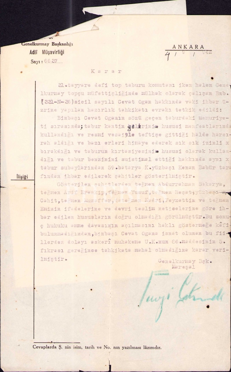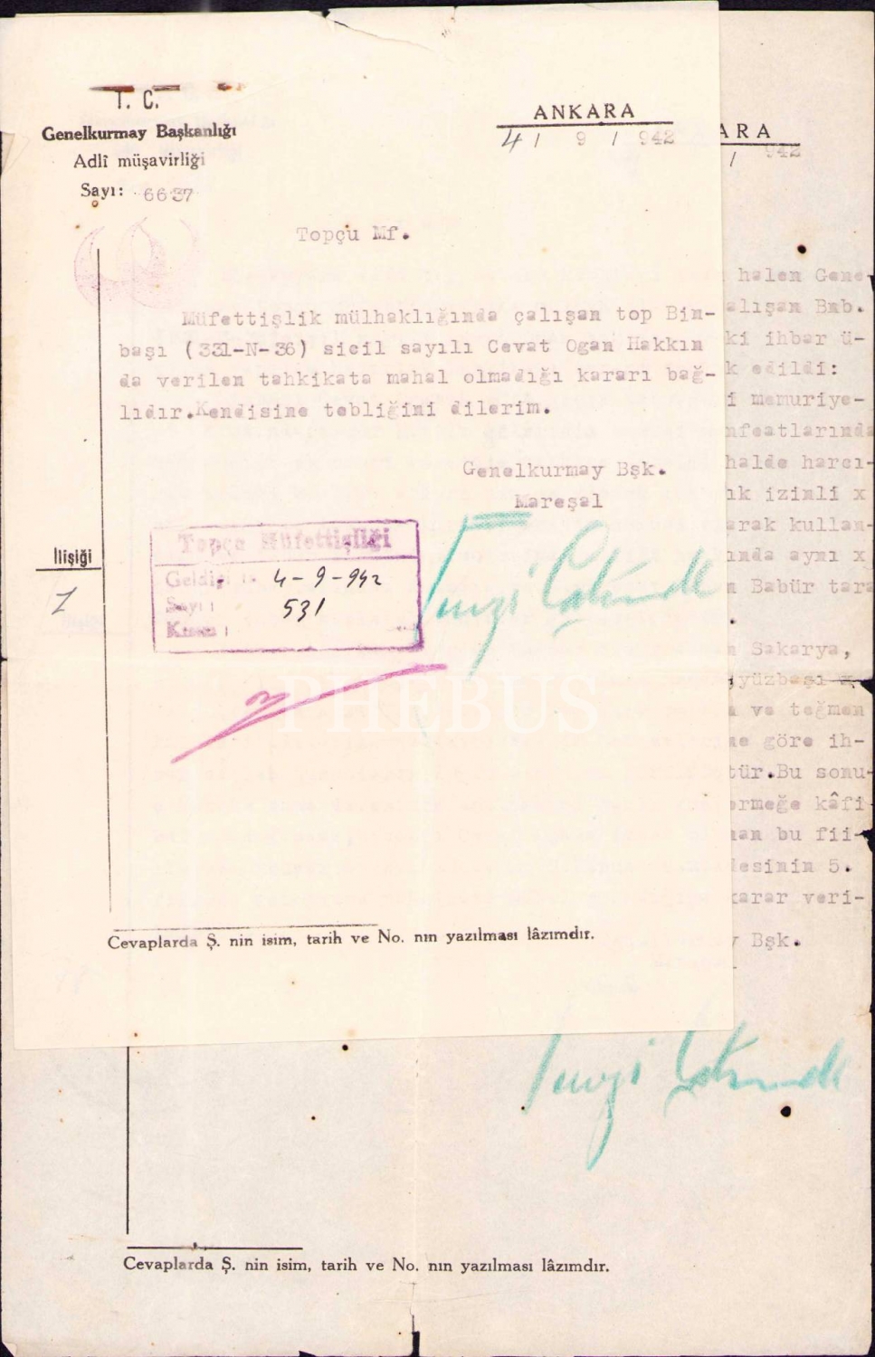Evrak: Binbaşı Cevat Ogan'a dair bir tahkikat hakkında olup Topçu Müfettişliğine gönderilmiştir.