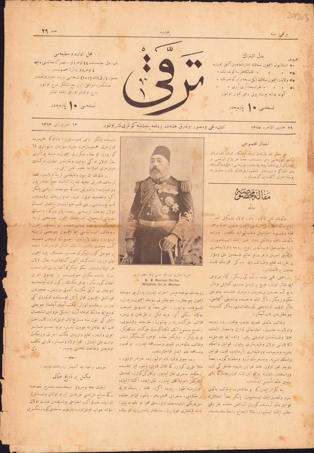 Osmanlı Terakki Gazetesi, manşet Bahriye Nazırı Hasan Paşa
