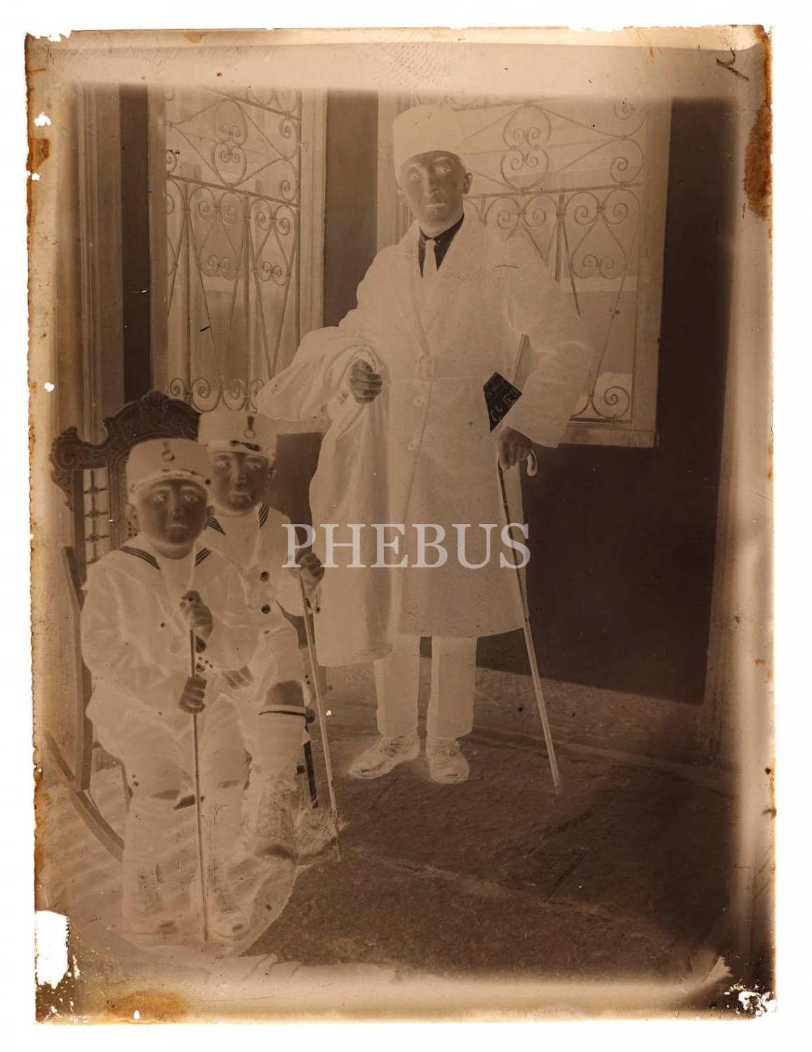 Bir Osmanlı beyefendisi ile iki minik bahriyelinin hatıra fotoğrafının cam negatifi, 9x12 cm